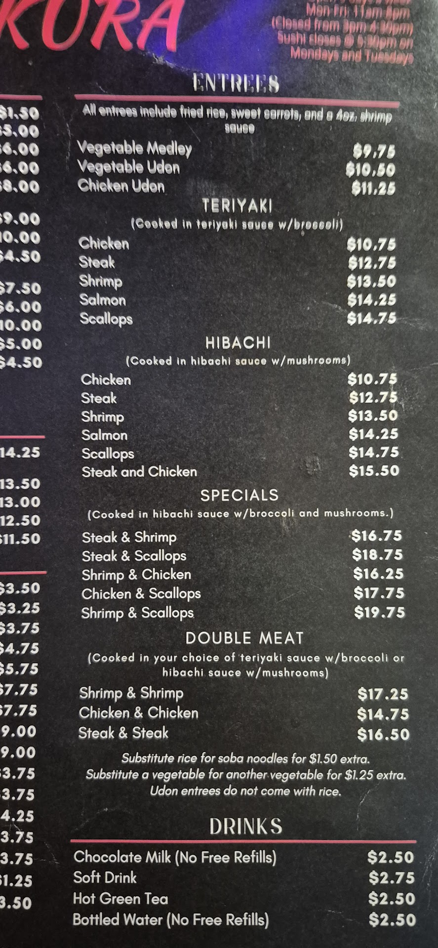 I took my daughter to Sakura on a Saturday night. The weather was getting bad and there were only a few tables of people. I ordered hot tea and we both ordered Miso soup. My hot tea must have just come from warm tap water because it was not remotely hot. Same with the Miso Soup. This item obviously came from the same dried packages you can get at Ingles. The tofu was tiny and obviously dehydrated. Also, mine wasn't even stirred enough to not have clumps of the dried mix in the bottom of the bowl. My daughter ordered steak and broccoli with fried rice. The steak was not a good quality meat and was incredibly over cooked and under seasoned. The "fried rice" was actually under cooked white rice with peas and carrots in it. It had very little seasoning and was actually still crunchy. I ordered a salad with ginger dressing. I was served a big plate of yucky lettuce that looked like it came from a bag with julienne cut carrots and about 5 grape tomatoes cut in half. The ginger dressing was sickeningly sweet with very little ginger flavor at all. The bulk of the salad was just wasted yucky lettuce that I wasn't interested in eating. I ordered the vegetable tempura appetizer that says it has 8 pieces of vegetables on the menu. I asked to just have broccoli instead of a variety. Apparently broccoli is more valuable because they only brought me 6 pieces. Also, their "tempura" consists of "southern fried" with panko. No tempura batter was used. Finally, I had also ordered the one thing I knew they did well. The chicken pot stickers. These are actually very good. Unfortunately, the waitress did not write down our order and totally forgot them. By the time they came, after I asked for them, it was so late we just got them to go. Overall, a very mediocre to disappointing meal. Sorry I wasted my time and money here. It won't...