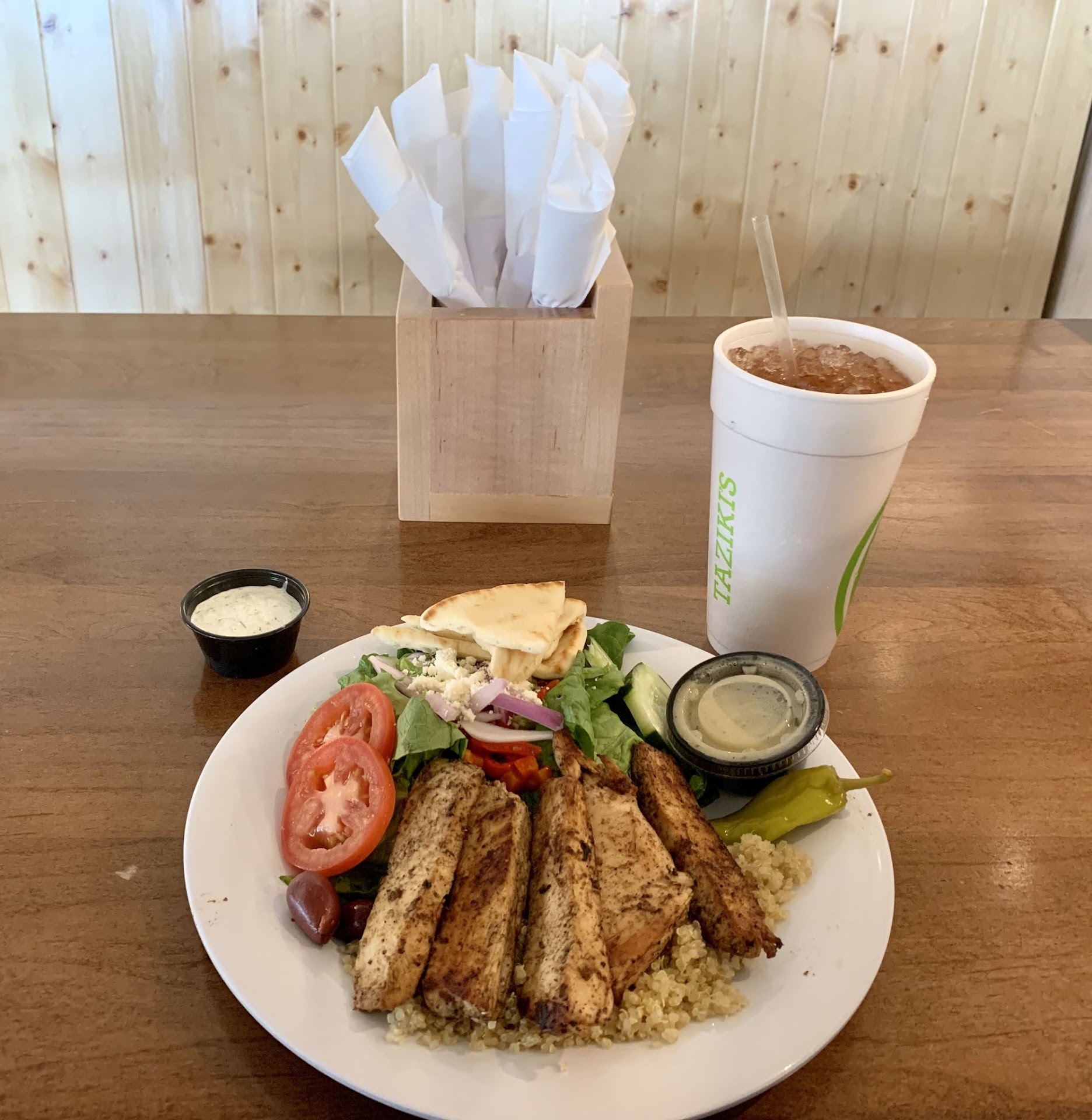 Read moreUnlike the Taziki's in East Memphis or Germantown, the Bartlett Taziki's near N.Germantown Pkwy has a drive-thru. It even has a larger fenced in outdoor patio with decorative overhanging lights if you fancy that cute or romantic ambiance while you dine outside. The staff is helpful if you have questions. There is a Taziki's app to aide you in keeping track of your frequent customer points/credits as well as ordering your food ahead of time. If you do not use the Taziki's app you still can receive credit for what you purchased by letting the cashier know you want to put your phone number in (their register screen that they turn around for you to imput) right before or right after you buy your items. Employees encourage calling in your order or ordering online but are happy if you order and dine-in or use their drive thru. Every time I have been to the Bartlett Taziki's they have been busy, so I recommend being aware of the time you will need possibly to wait to order and wait to receive your food. Alcoholic beverages are available for those who dine-in. There are handicapped parking spaces available in front of the entrance as well as boosters and high chairs for younger children. Diaper changing tables are also present in bathrooms. Straight up, Taziki's Mediterranean Cafe offers many, many, many filling and extremely tasty options on their menu. The presentation, color, aroma, quantity, taste, and low cost of Taziki's food will...