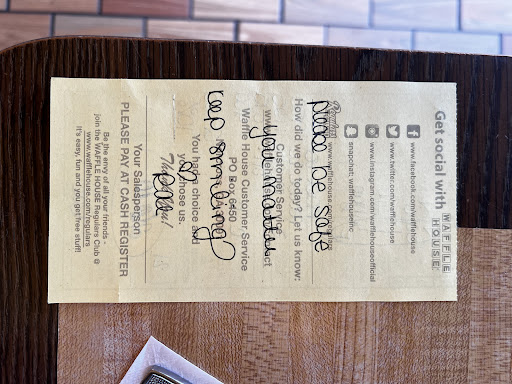Oh boy, let me tell you about the fella who thinks he is in charge. About two weeks ago, I was asked not to Vape in the store. Inconvenient, but sure thing. No problem, I didn't think another thing of it. But today, the star of our experience is a very important young man named Tommy. Apparently, this Waffle House is HIS restaurant and if given the opportunity, he will let you know. Well, I had brought my Vape with me as I always do and, not thinking, I had hit it at the table. Tommy and I made eye contact and I remembered not to use it in the store. I did not use it again! About 10 minutes later, Tommy came up close to the table and just stood there for about 5 minutes. After this extremely awkward period of time, he tells me that if I use the vape again, he will throw me out of the restaurant. This would have been all well and good, but he then proceeded to make this point again and again and again. I asked him several times if he was done and gave no resistance until his ridicule went on for far too long. My office manager was also with me, and both of us were blown away by the outright disrespect and obvious desire for conflict. He went on to threaten that I would not be allowed back to the restaurant. Again, I was not arguing the point but he continued his verbal assault until I felt it necessary to ask him if he felt like he needed to make the point yet again. I have been eating at this Waffle house for more than 30 years, but after this interaction, I will never patron another Waffle House as long as I live. I don't know if this Tommy fella is a key employee to this location or not, but I wouldn't have him represent any company I was involved with....