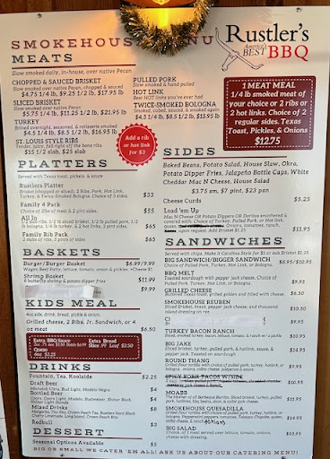 Read moreTHIS IS THE PLACE! This establishment is a terrific representation of a great restaurant operated by friendly professional and caring staff. It's always a good sign when the manager (If I recall correctly, I think that it was Steve) follows-up greeting and inquiring with customers at their dinning table. A na'uce dude. That's the Oklahoma style that's been lost in the evolution and progression, and it's wonderful to see it revived at this-hure eatery! Best of all, of cOUrse, is the grub. Great BBQ that's quickly earning a reputation as one of the NATION'S best smoked meat joints. Smoked pecan pies too! Try it, it's good. The prices are competitive and a fair value for the load of meat that's served. The environment is also a fabulous representation of what a Okie Bar-'b-Que rest-aur'ant OUght to look like, with lots of custom rOUgh milled lumber and tables that just look as if real men made em. The decor is appropriate and certainly adds to the ambiance of a BBQ rest-aur'ant. It's a dinning experience & far from typical. And, just in case someone thinks that they can tackle a real Okie sized portioned sandwich, Rustler's offers "The Fatboy Special" which typically remedies every bit of the ole hunger "pangs", however it's not fur the weak of heart. Sissies beware. Thure fixin's are ever-bit as good as them-there entrees being smoked & carved up. The sauce is superb. It's a smart location about a half mile north of I-40. They like classic vehicles, bikers, families and veterans. My prediction is that this restaurant will do as well as they want to, and we the patrons stand to benefit the most. This place will become OUr reg'u'lar stop when we travel in the eastern portion of the great state of Oklahoma, where "it's all abOUt the people," and the Bar-B-Que. Highly recommended with a...