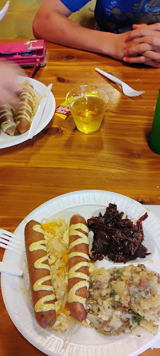 Read moreI'm typing this as my son keeps running back and forth to the bathroom vomiting. He's been throwing up for an hour and my husband has been sick ever since we ate there. My husband ordered a ribeye sandwich which consisted of a plain slab of meat completely soaked in steak sauce slapped on a bun. Very plain with basically no effort from the kitchen staff. I had the caramelized pear and Gorgonzola bratwurst which was fine, just not my cup of tea. My two kids had the hotdog kids meal which was okay. The sides having to be bought separate for $5 for a tiny little serving is a bit ridiculous. The smoked Gouda pasta salad didn't taste smoked at all and was very similar to a boxed pasta salad. We paid $60 for 2 adults and 2 kids. The MAIN issue is their completely unsanitary distribution of samples. They just have multiple open containers sitting inside their coolers on top of products so people have to pick them up and move them if they want certain things. There are toothpicks in a dispenser but they were all scattered on the top of the cooler. Against my better judgement, we tried them. Some were definitely bad from the moment we tasted them and had to wash it down. There's got to be a better way. The only one that didn't end up sick was my daughter that declined to have a sample. On top of that, they shut the lights off and put up all the chairs right after 3 when we (and several others) had only made it halfway through our meal. And judging by other reviews, this happens every day and hasn't changed in the years that people have been complaining about it. It's very disappointing to only have 3 brat flavors offered as well. Had we been able to try some of the other many flavors we might have bought some to bring home. After what we had though, we will definitely be going to Swiss instead. Honestly kind of feel robbed of our entire weekend. With everyone sick, we had to cancel holiday plans and my son will likely have to miss school tomorrow as well. Really disappointing for an award winning meat place.