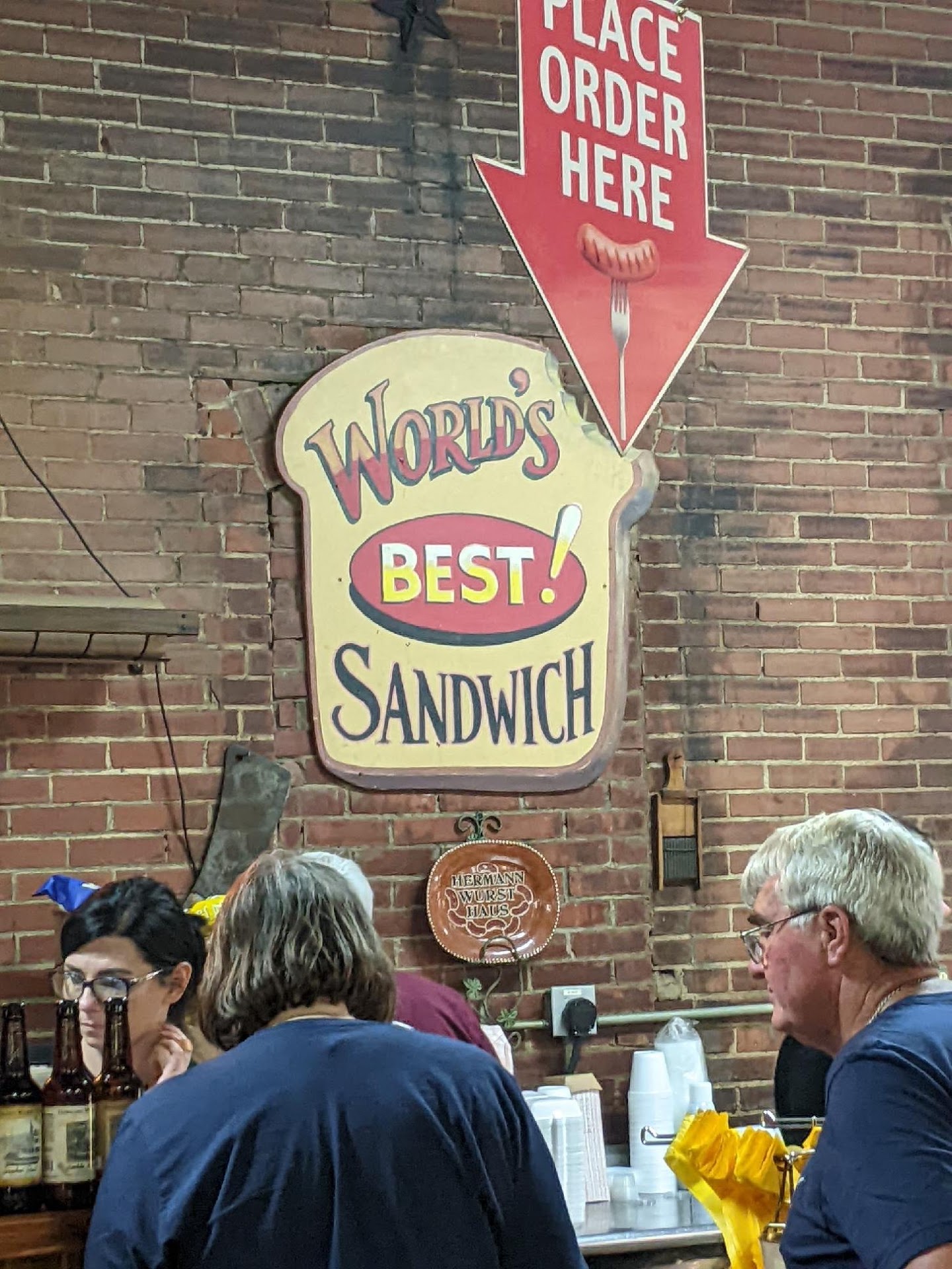 Replace the “u” in Wurst with an “o” — and honestly, that says it all. I absolutely adore Hermann, MO. It’s a sweet little town with all the cozy charm you could want. My husband and I have been stopping here for over 20 years during our military moves across the country. (Side note: He’s from Kirksville, so Hermann is basically our unofficial pit stop.) Also, shoutout to Adam Puchta wine — love that stuff! But I digress... onto the food. So, I ordered two sausage platters, all served on Styrofoam plates with plastic silverware. And guess what? That gourmet experience set me back a cool $93.00. Can we talk about sticker shock for a minute? Now, let’s get to the “meat” of the matter: Portions sadly small. The sides were basically a large tablespoon. German potato salad: Surprisingly decent. Potatoes were firm (not mushy), with a nice flavor and a hint of sweetness. I’ll give credit where it’s due. Red cabbage: Bland. Like, “did someone forget to invite flavor to the party?” bland. The sausage: Also bland and oddly firm — like it was training for a marathon or something. Sauerkaut: - wait for it... came with yellow peppers. Yellow peppers?! Who thought that was a good idea? Maybe to bulk up the portion? Definitely didn’t add anything tasty — just weird vibes. But the absolute worst part? The ordering process itself. A complete circus that made me question every single life choice I’ve ever made. Here’s how it went down: We ordered drinks—explained clearly to the cashier what we wanted. Bloody Mary for one, and a Riefenstahler by Adam Puchta for the other. The order then magically gets sent to the bar in the back. So my girlfriend, thinking all was well, goes to the bar to grab her drink. The bartender asks, “Sweet or dry?” She says “sweet,” assuming he already knows what she ordered.