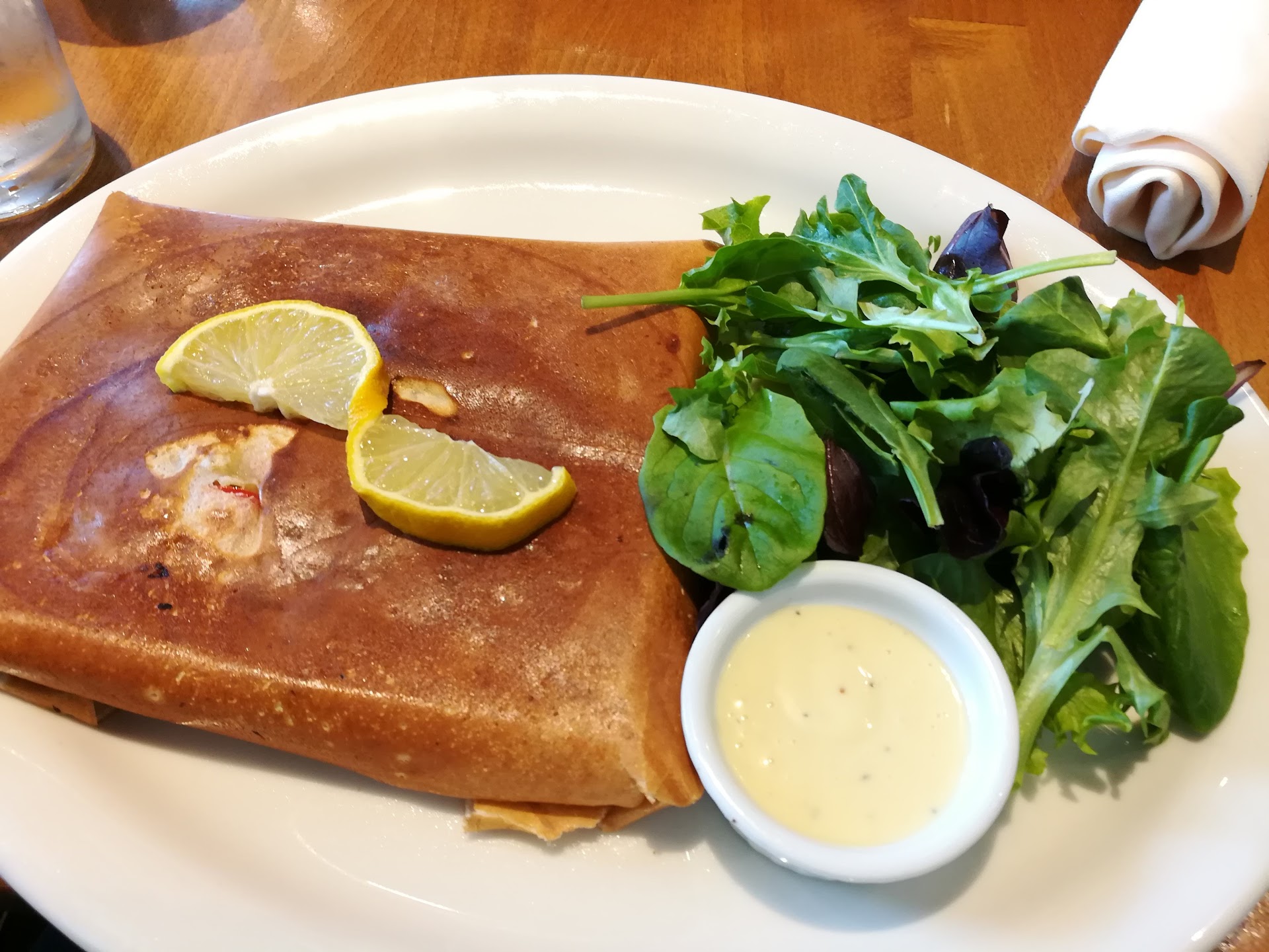 We ordered our drinks and food. When the food came. My friend did not like the salmon because it was raw, he asked if they could cook it all the way through. The server went and brought him a plate of more raw salmon. My friend explained again if they could cook his crepe longer the server rushed and said "oh yes" before my friend could even finish his sentence. The waitress came and we tried explaining to her that we didn't want raw salmon. She said ok. And ignored our request for them to cook the crepe longer. They ended up bringing us a small piece of salmon that was so over cooked and dry it was gross. At thus point my friend and I had given up and he was so hungry he just ate it.