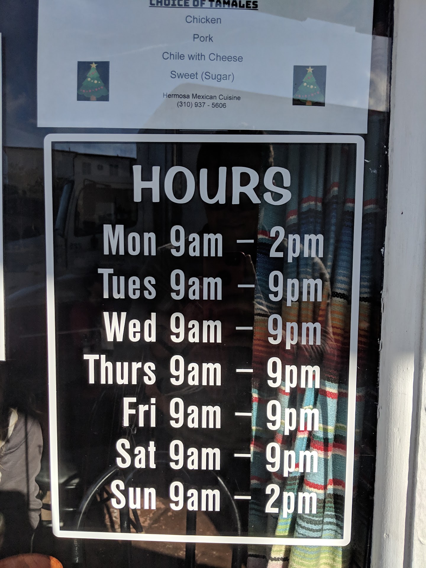 Family run and operated. Cozy little spot near Hermosa Beach Pier. Yes, we all know the place is small. I don't recommend it for large parties. Order to go and have a seat on the beach, it's right there. You can't beat the view. Despite the size of the place, The real magic happens in the kitchen. The art of great authentic Mexican food isn't something you just smother with cheese and salsa. It comes down to the ingredients used day in and day out. Been coming here for years and it's hard for me to decide what is my favorite meal. The main man and the master chef always has surprises up his sleeve; the best meals aren't on the menu ;)