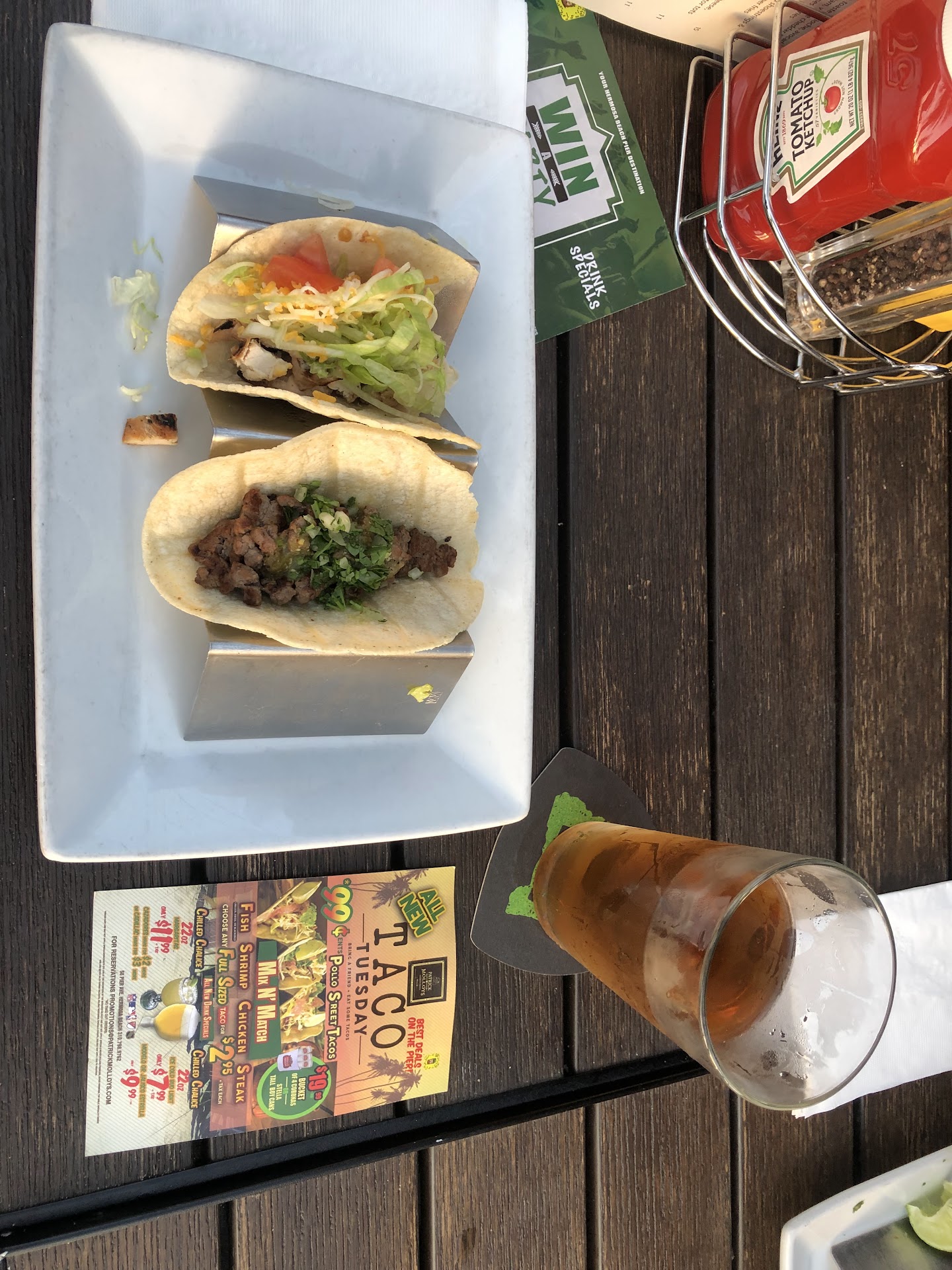 Read morePassed by this restaurant during a walk on the beach. Decided to drop in due to their happy hour selections. My husband and I were not greeted or met by a host. We had to hunt down a waiter to ask if we just seat ourselves (the restaurant was not even busy). Servers were not very friendly. Our order was wrong and we were overcharged, and were not offered for our food to be corrected, just told that the cooks messed up. We ordered pizza, Boneless bites, and a brownie Sundae. The pizza was really good, my husband liked the chicken (I thought they tasted a little different), and we thought the sundae was good as well, though it had more of a cake consistency rather than a brownie feel. When I asked our server about adjusting our bill, he did it under protest, and said they're going to make a future rule that you can't modify a pizza (since we ordered half cheese, half bell pepper, mushroom, and sausage - except the pizza was missing sausage). The Happy Hour special is $11 for all pizzas. I asked to be charged for the Veggie pizza (which came with all veggies, but to remove all of them except the bell peppers and mushrooms - since we didn't get the sausage). I guess it's difficult to hit the "No" button. The restaurants nearby were packed. Perhaps the servers here can shadow some of the servers nearby to learn better customer service skills. I think this would be a great way to...