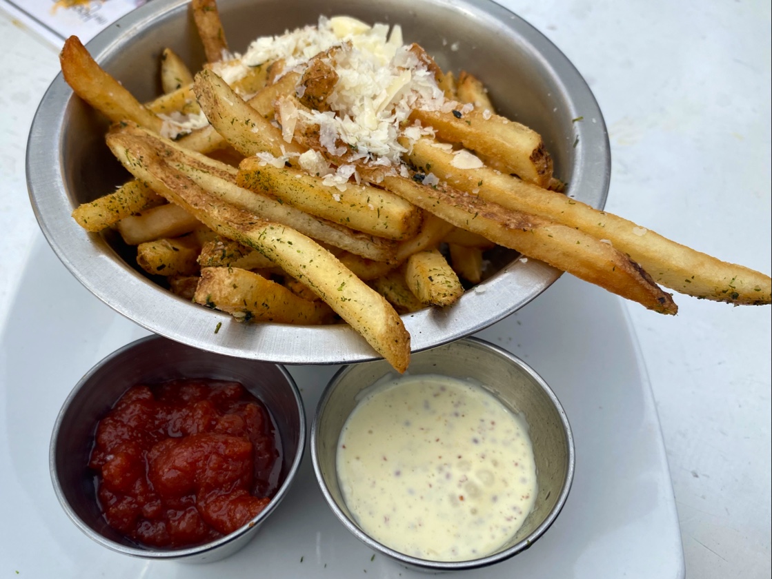 We found the fish tacos a little bit dry. The fish is fried and is served on corn tortillas. I think if these tacos were to have a bit more moisture, like maybe a salsa or some pico de gallo, that would help. The French fry sauces were both very tasty; we very much enjoyed the flavors. The clam chowder also had a little different twist to it which we liked too!
