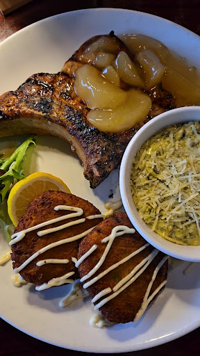 Read moreFirst time eating here. We enjoyed it. The hostess sat us quickly, with it being a Tuesday evening, it really wasn't busy at all. Our waitress was kind and informative. Our food was delicious. I ordered the Blackened Catfish from the special March menu. It was on a bed of rustic ratatouille and Cajun remoulade sauce. It was top tier delicious. I'd recommend it and have it again. My husband ordered the Porterhouse Porkchop, and it could have used a little more seasoning, in my opinion, but overall, the sear was great, and the touch of pears was nice, and the crab cakes were very good and packed with tons of flavor. The spinach cream sauce was delicious, and I could taste the spinach very well. I also ordered the crab stuffed mushrooms, and they were extremely flavorful, and I was very satisfied with them. I enjoyed the small spring salad with goat cheese, mandarin oranges, and cranberries. We ordered the chicken strip appetizer, a side of fries, and a side of mac and cheese. I would definitely do better on the mac and cheese being served, skip the box mac and go homemade instead. I can not believe Kraft was served to us, especially for $9.50. Which should've been a kids' meal, if I'm not mistaken. I'll pay attention next time when we order a kids' meal to make sure we get everything that comes with the kids' meal instead of being charged separately for each item. Other than that, we were pleased with our experience, and we thoroughly enjoyed our main meals. We will definitely be back to try the other items. I look forward to...