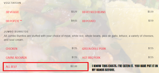 I got the “Super Burrito” with season chicken. The burrito was the size of my hand smothered in red sauce. The burrito was flat because they was no ingredients inside. At first I thought I ordered off the kids menu. The flavor was red sauce with red sauce on red sauce. The red sauce tasted like they opened a cold can and poured it on top. It came with rice and beans which tasted like red sauce. You wonder why? It also was covered in red sauce. Catch a theme here? I should have taken a picture. All for about $13 on a plate half the size of a regular dinner plate.