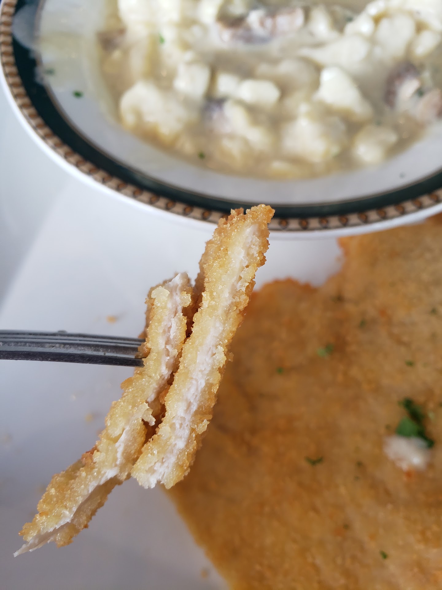 I had lunch here today and read reviews before I went about "a lot of native German customers so food must be good". As native living in Germany for more than 40 years my opinion about the food is "soso" or in German "na ja". I ordered "Gemischter Salat" or mixed salad. I was baffled when the $6 plate arrived. First, in Germany a Gemischter Salat always has a green salad base accompanied by other salads. Here the green salad was missing, they had arranged few half wilted leaves with no dressing in the middle. The other salads were pickled carrots (tasted good but never had pickled carrots in a Gemischter salat before), cucumber (ok taste), red cabbage (good) and German potatoe salad. That one was actually really good, but so few pieces that it was ridicules. Pro-tip: don't arrange tiny amounts of salad on the biggest plate you have. It just looks sad or like left overs. Then i had wiener schnitzel with cream sauce and Spätzle. Technically the Spätzle were Knöpfle, but that is small and not really important detail. The portion was super small, in fact it was less Knöpfle than sauce. The sauce itself was ok, on a positive side it had fresh mushrooms in it, but it had basically no seasoning. On to the Schnitzel. First impression was that it's a lot of meat. 3 pieces. In Germany you usually get 1 max 2 Schnitzel. Real surprise was that each Schnitzel was only 1mm thin. I have never ever in my life seen such thin Schnitzel. In German we would say "ein Hauch von nichts". Again, the meat was not seasoned whatsoever and it was deep fried for too short which resulted in a very pale color. Summary: not sure if...