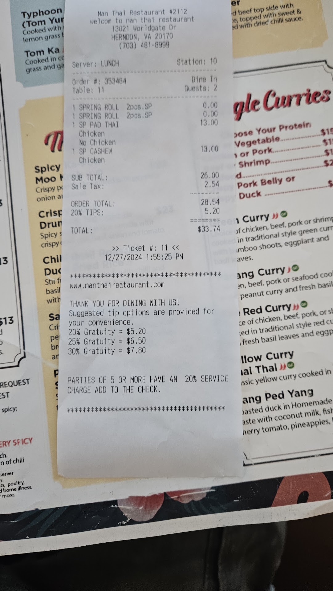 Read moreThis place used to be our favorite Thai place in Fairfax but after our last visit, it quickly became somewhere we will never visit again. After enjoying our delicious pad thai and cashew pork we asked for the check and we're surprised by the total. A 20% tip had been added without our prior knowledge and upon consulting the menu we only noticed a mandatory gratuity for parties larger than 6. We asked our waitress why a 20% tip was added and she explained that because after our last visit we did not tip she added it for us. I told her that a tip is not a requirement at any restaurant and it was a reflection of our opinion of the service. I then asked for the manager and when she came she told us the same thing. I explained the same point about a tip never being required and told her that I would have tipped had they not pulled this on us. She said that she would then remove it if we tipped and I informed her that I would not tip after this happened but she still needed to remove the tip they added. She then told me how they only pay the waiters $3/hrs and the tips were how they made money. I informed her that a tip is never required and that it is not my responsibility to pay the employees. I told her if she didn't remove the tip I would contact the police and she told me to go ahead. Upon contacting the non emergency line she immediately provided a check without the added tip and I informed the police I no longer needed their assistance. She then proceeded to sarcastically say have a wonderful day. At the end of the day I strongly recommend nobody give their business to this location because of this...