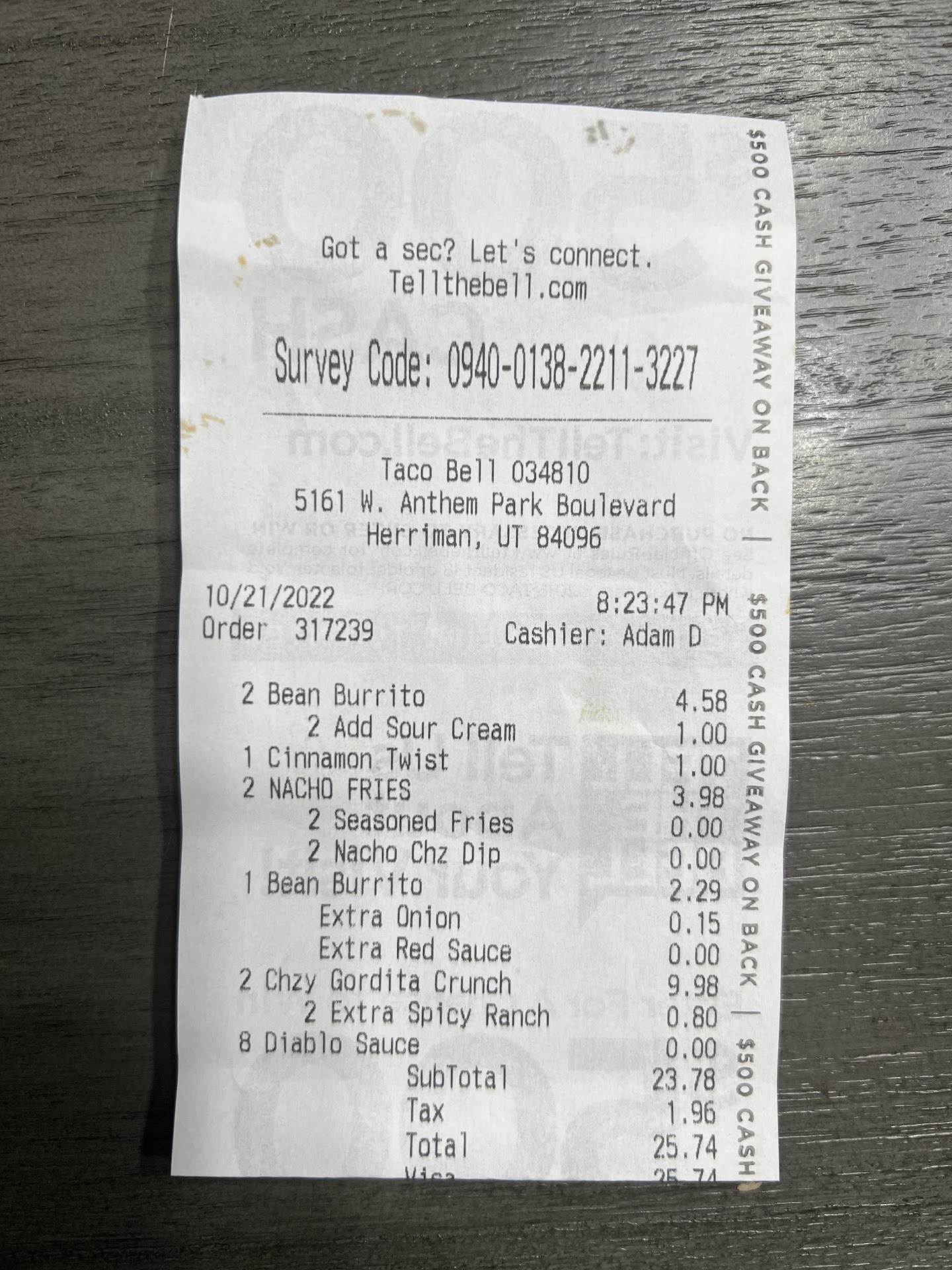 I went back to the main door and parked again. While waiting, I saw another skinny guy approach my location and hand me the food. Truthfully, I wasn't expecting to hear what he said, and this is exactly what he told me: "Next time you come through the drive-thru, you need to turn down the volume of your music."