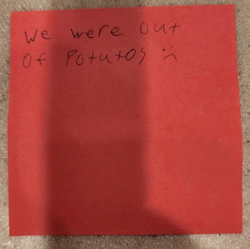 4/4/22: Another fun trip to Wendy's. I placed a mobile order which included a baked potato. Instead of a potato I got a sticky note that said "we were out of potatoes :(" (see photo). They couldn't even say it to my face.