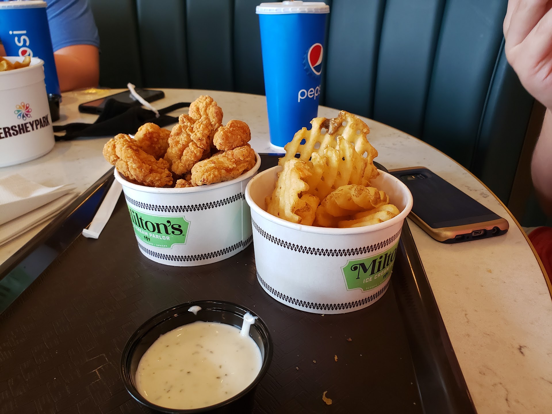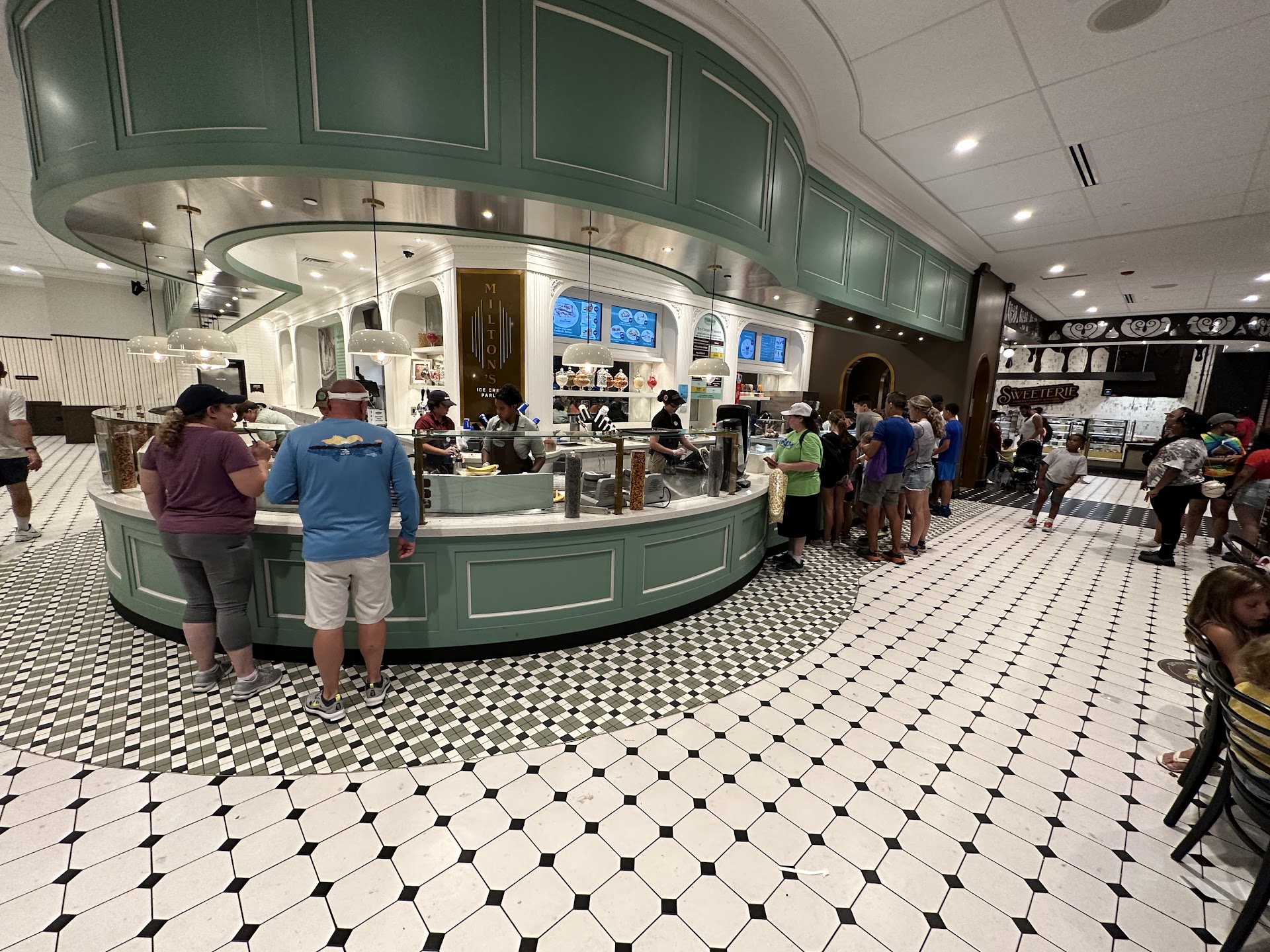 Read moreMilton's is unfortunately an example of the state of the service industry in America right now. The staff treat the customer like an annoyance and they seem to hate their jobs. This place had a long line which is what a day in an amusement park is full of anyway so it's expected. The problem is the set up. You order and pay all the way at the right of the counter but then are asked what toppings you want which is are all the way at the left of the 30 foot counter. So for all five of my family you had to walk back and forth for each order just for the toppings (see pics). The tables were filthy and so was the bathroom and no one was cleaning anything for the half and hour we were there but we saw a number of staff going in and out of a service door to the back doing...