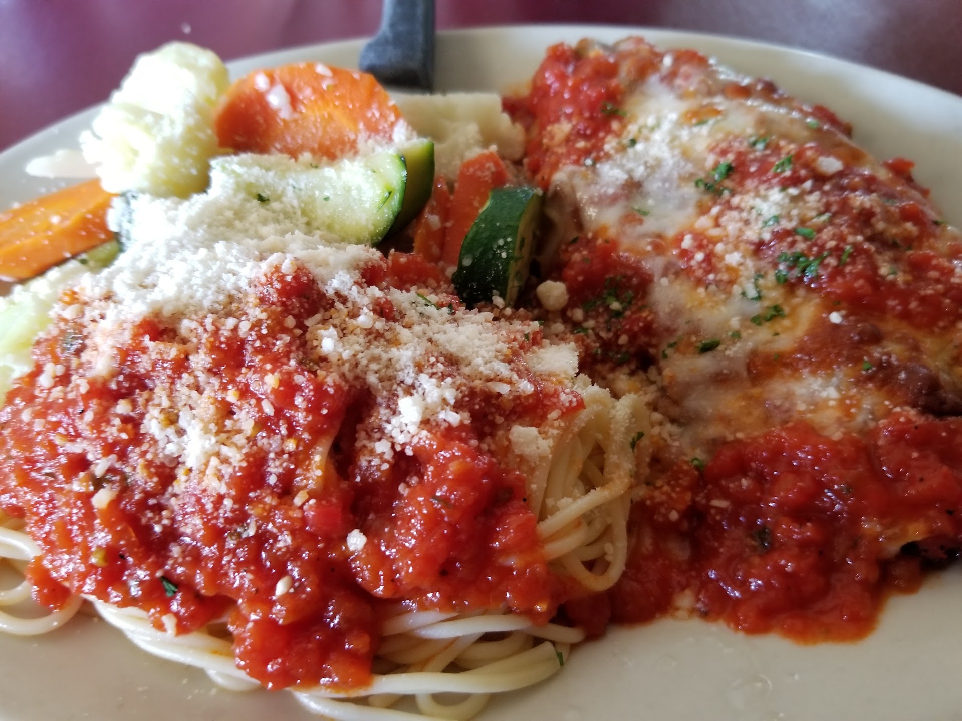 The Chicken Parmesan has a thin slice of eggplant on top which is out of this world. I pair mine with double capellini pasta side with extra marinara. The chicken is tender and flavorful. Itās my go to first choice here.