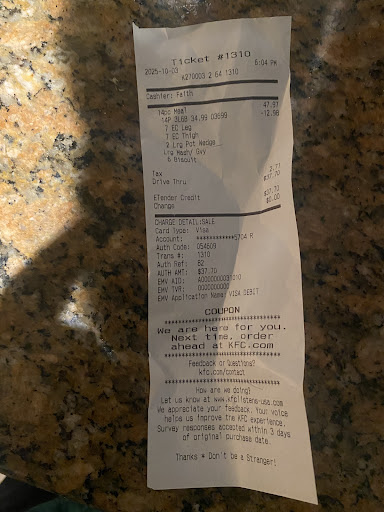 Just left this store never again will I return. They refused to do two separate at the drive through. So I said I would come inside I could the attend laughing and saying she's coming in. I came inside with my sister placed my order and then told the cashier my sister is hanicapped and does math a little slower he said ok and helped her the only person that was descent in that place. keep in mind I can hear the manger and everyone still talking in the back even worse they are laughing at my handicap sister who paid in cash and I paid with a card. When I asked for the cooperate number the cashier went to the manager and asked for it you can hear her yell tell her to read the receipt it's on there he tells her no it's not. She then comes up and said well she should know it it's 1-800-call-kfc then grabs the receipt and writes it I ask for her name and the drive thro attends name and she replies you can have mine but you don't need hers I said yes I do! She said that's my employee and I don't want to give it to you I don't have too. I asked since when do you not take two orders at drive through she said forever but it doesn't matter it's her policy and she's the manager keep in mind she is only the shift manager didn't wanna give any other managers names out not even district. As she is telling me all this she's laughing at me and the other employees staring through the back window. My sister still standing by me almost in tears because she's embarrassed about her handicap. I continue to try to get any information for her and she continues to brush it off and laugh then stops and said I'm done have a good night then walks to the back leaving me at the counter trying to get her to come back. I have never been so disrespected in my life. To the point is that I was in tears for the utter slap in the face and my sister feeling horrible...