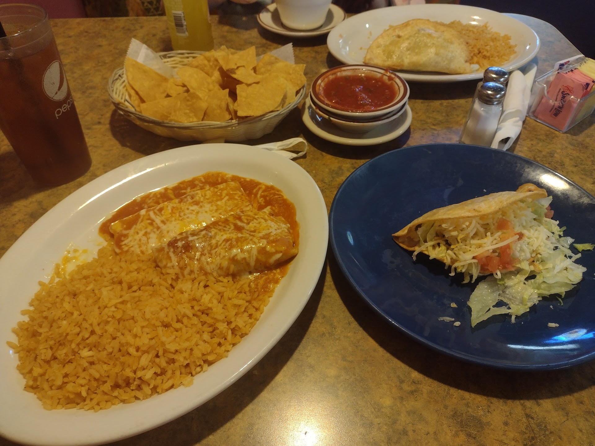 The overall is 3 stars because the actual main dishes where straight up microwaved food. I had 2 enchiladas one chicken the other beef. They where mushy absolutely no texture. Soft, mushy, microwaved, precooked frozen, the plate was hotter then the food.....anyone who has ever used a microwave knows that feeling of grabbing a scolding hot dish from the microwave. Just for the food to be half the temp of the plate its self. The sides on the plate where good. The rice and beans where hot and flavorful. If i had to guess. They nuked some small frozen enchiladas. And then added the rice and beans. Serving size of the enchiladas was a joke. Each one was about the size of a cigar. So great service. Good sides and salsa. Absolutely microwaved junk for the main.