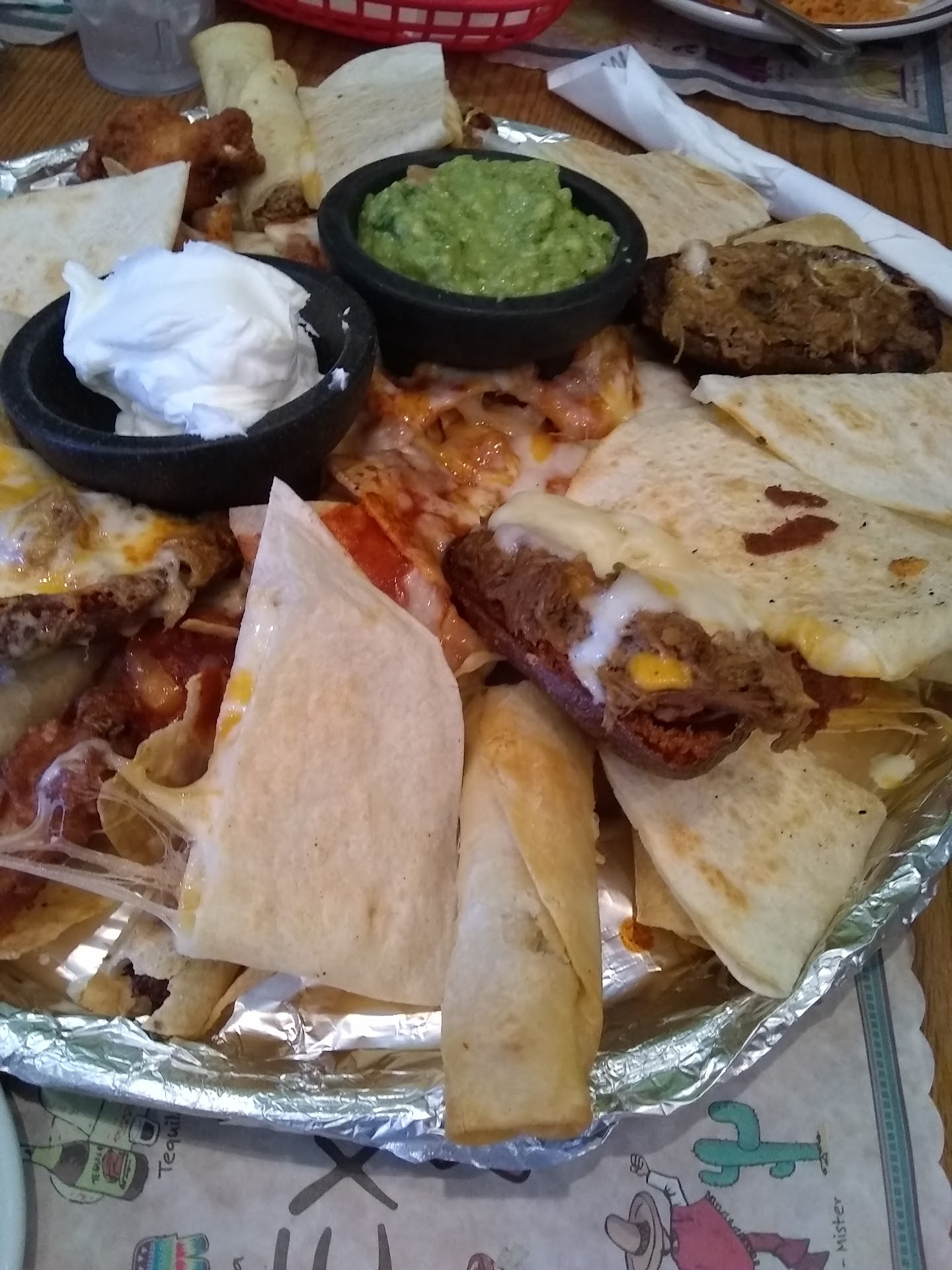 I ordered the fiesta platter, a giant appetizer with enough food to feed four or five people. It came with taquitos, flautas, quesadilla, hot wings, nachos, potato skins, beans, sour cream and guacamole. The price on this was very good for the amount of food you get. The problem was everything was so plain. The guacamole did seem watery and bland. Plain avocado slices would have more flavor. I'm not sure how someone could mess up avocado/guacamole but they did. Nothing was seasoned. I had to ask for hot sauce. The brought a house made salsa and Tapatio. The house salsa was a dark salsa made from tomatillos and chili pepper. It had the most flavor of anything we tried. It was very fruity and not spicy. It needed some salt, onion, cilantro and more chili. The wings are seasoned before frying. They were very crispy. Wings that are seasoned before frying are generally frozen wings. I'm guessing that's true here as well. The potato skins come topped with shredded beef and cheese. I had a huge gush of grease come out on first bite. These seemed to be deep fried. With Tapatio and salt they were good. I suspect the actual potato skins were a frozen food product.
