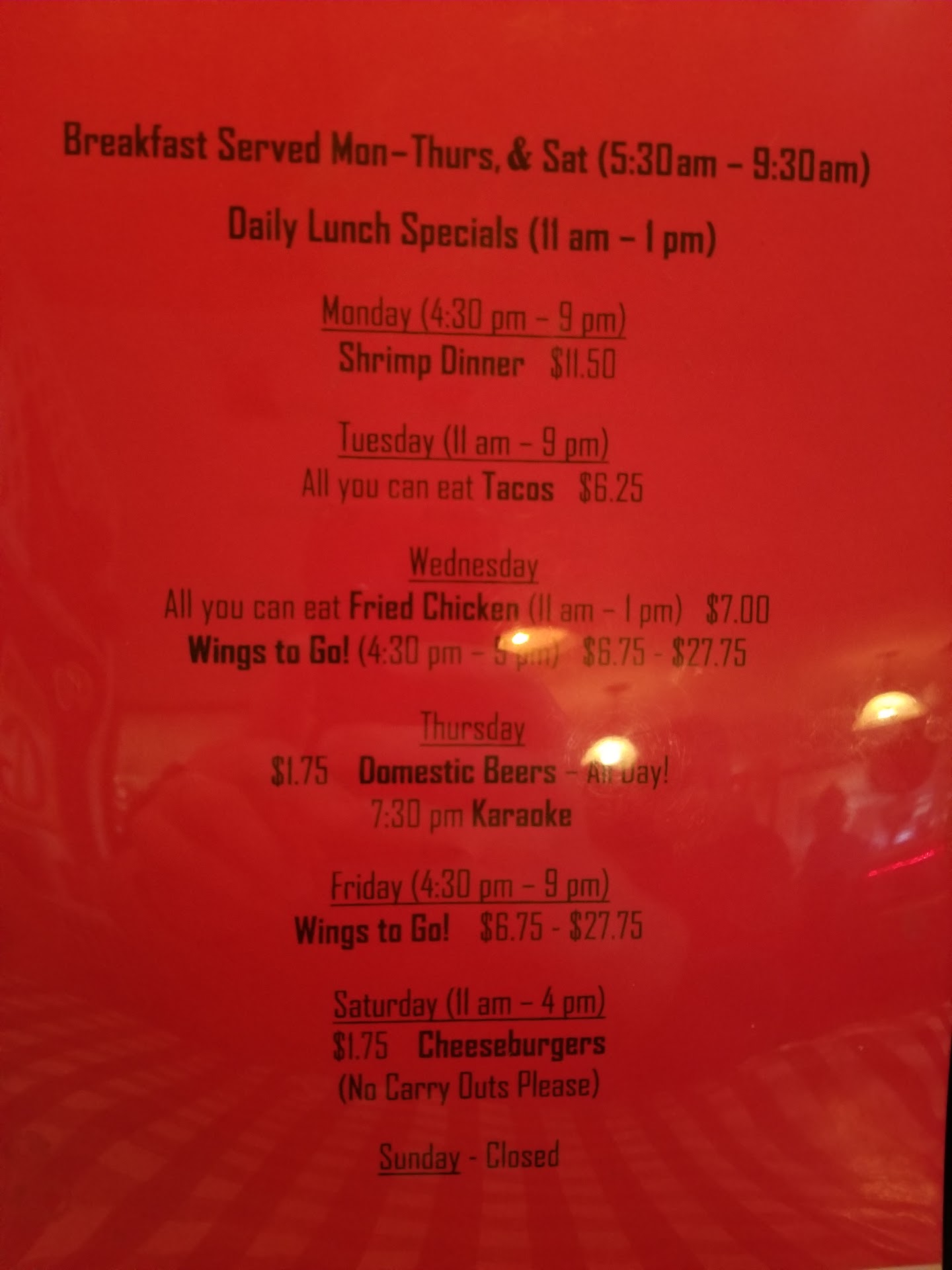 Going on Saturday night at 6pm appears to be a good time to eat before the night crowd started. We're not bar people any more and ate there before the school play across the street at Heyworth Jr/Sr HS. It was fast and the food was great! The onion rings were possibly the best I've ever had. Also great were the pork chop and tenderloin sandwiches. It's a bar & grill so you might be seated back to back with someone playing video slots. They don't take plastic so remember to take cash. 👍if you like this review. It'll help me do better in the...