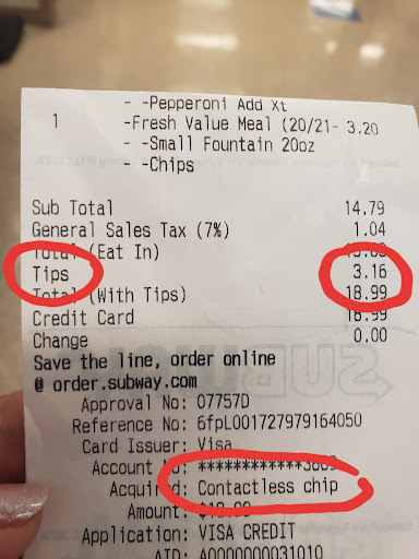 I am fully aware that Subway checkout machines ask for a tip before one can swipe the card payment or hold the card close enough to charge it touch less. The lady told me the total is $15.83, but it didn't show any number on the card processing device. I held it close anyway and it beeped. Then, the lady pushed a couple of buttons on her register and the amount of $18.99 showed up. She commanded me to swipe the card, I held it close enough to read it and it beeped again.