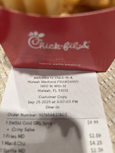 I canāt believe what happened to me in the drive thru in the chik a fil in 1600 West 49 Street , Hialeah . First the drive thru is extremely narrow honestly not for Two Lanes with cars almost dude swiping you if their order is done. My first terrible impression was in regards to my order : I ordered and 8 piece nugget / fries / 4 crunchy kale salads I asked the lady that took my order ( she was niece ) to please give to cups with ice. The reason why I didnāt order drinks is because my daughter had just been admitted to the hospital with severe complications from Covid. Sheās immuno compromised. After staying in line with crazy drivers almost hitting my car I got my order. I told the person giving the orders that I had asked for 2 cups with ice. His response was that it was a policy of chik a fil to give only 1 cup if ice per person !!! What ? The company is proud of Christianity ⦠itās not Christian to negate water to a customer. He told me itās one cup per person to what I told him that this order wasnāt only for me ! Btw he gave the food in 2 small paper bags not in the customary plastic tote to go . When I got to the hospital I started eating one crunchy kale salad and started notifing that the salad was poorly made. Since I was introduced to Chil a fil by my daughter last year. Iāve become an avid chik a fil customer ā¦.. I love the crunchy ksle salad, nuggets and fries ā¦. We all do love A good Chil a fil and we frequently have it. My husband and youngest daughter have the sandwich deluxe . My oldest loves nuggets , fries and crunchy kale . My other 3 love everything in the menu. First time from this location ( the other chik a fil in 49 street is awesome food , attention, they donāt have a drive thru ā¦. You park and a server comes and gets your order and pretty quickly you get your delicious food. Now not only this location 1600 West 49 street HAS NO SPACE FOR A DRIVE THRU, THE FOOD IS BAD ā¦.. the kale salad ( my favorite ) I can barely eat it ā¦.. itās stale and with rotten Kale pieces. BELIEVE IS BAD ā¦ā¦ the fries old and soggy. The icing on the cake was that they refuse to give A SECOND CUP OF ICE. Even though there was food for more than one person. The reason why Iām taking time from my busy schedule is because I LOVE CHIK A FIL AND THUS SHOULD NEVER HAPPEN TO A CUSTOMER. I Demand an apology and my money back ! The food is old / nuggets are ok but not fresh ā¦.. we canāt eat this I WANT MY MONEY BACK and an APOLOGY. TO STAY OPEN THIS PLACE : CLOSE THE ā DRIVE THRU ā / SERVE FRESH FOOD NOT THIS CRAP / LAST BUT NOT LEAST : something that has impressed through out the country cause everywhere I go I look for a Chik a fil CUSTOMER SERVICE ! This location needs to educate the employees in what they are SERVICE TO PAYING CUSTOMERS ! THIS IS THE WORST CHIL A FIL IN THE COUNTRY. Also donāt know how inspectors from the city of Hialeah have given permission to the ā DRIVE THRUā .BTW looking at the purchase ticket it said 3...
