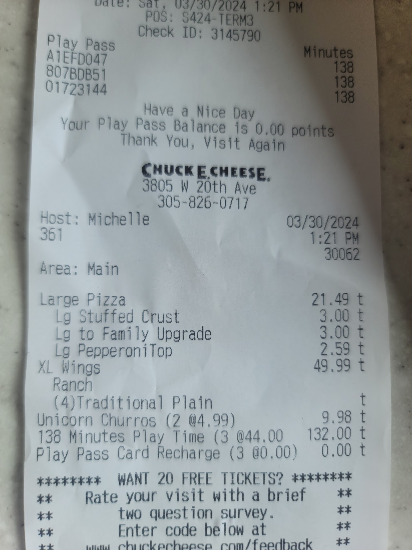 Disorganized, staff doesn't communicate very well, poor management.. all of these describe a recent experience where I took my 3 children to this particular Chuck E Cheese. We were in Hialeah this past week, and my husband and I decided to stop in for a few hours for lunch and play. We purchased the 90-minute AYCP wristbands for each of the kids. The original wait time was moderate, no problem. From the line, two of the three kids bolted with dad to their favorite games, and the other remained with me. They ran and found me, "mom, the card isn't working." we tried for another 6 minutes, and "processing" remained on each machine we tried. Turned to get back in line, with about 9 other families, all for the same reason. Everything went out of order.. while at the register to get my money back and go somewhere else, the male manager there had "resolved the issue" and assured me everything was up and working again.. (During this time, the kids were waiting for their food to come out) Food comes out, we ate. My youngest (who was last before) was ready to play first. The first machine, "processing" second, third, all the same thing, fourth machine worked, but everything else after did not. The one machine that worked quickly built a line behind us and eventually stopped after 2-3 people later. I went back to the line, which was now filled with birthdays, new customers, and existing who were just as frustrated awaiting refunds. I found the manager who assured me the machines were working and requested a refund. He again, "promised everything was operating," and told a staff at the register to "make sure you process the birthday parties first." Another mother pushed past and began screaming at him that he lied to her, her entire party was there, and they couldn't get anything to work in nearly an hour of being there. The kids were bored, etc, filled with foul language. I told him, I didn't have any faith in him or his staff being honest or their ability to stand by their word with integrity we had originally hoped for and told him to refund me the price of the wristbands and the kids time in full (I paid for the food, obviously as we had already ate). Received the refund and left. Took the kids to "In the Game" at Sawgrass, paid less than half of what I did at Chuck E. Cheese and the kids each played for two hours and enjoyed a shake. Save yourself the headache, either go another location who can take pride in honesty about the machines being down from the beginning or just go to "In the Game." I understand things happen, and systems become overloaded.. my complaint is they were dishonest with everyone.. just explain your system is having issues and that you'll begin taking payments again once it's back up, but over an hour and a half, AT LEAST, you're aware of the issue, stop having people continue to buy time they will never see outside of "processing". Between the food, both lines, tracking the manager down who was in the very back, we lost over an hour and a half ourselves.. no integrity.. we won't be back. I'm only giving 2 stars because I felt bad for the remaining staff taking the heat behind miscommunication between management and "corporate" who were trying to fix an issue the staff believed had been...