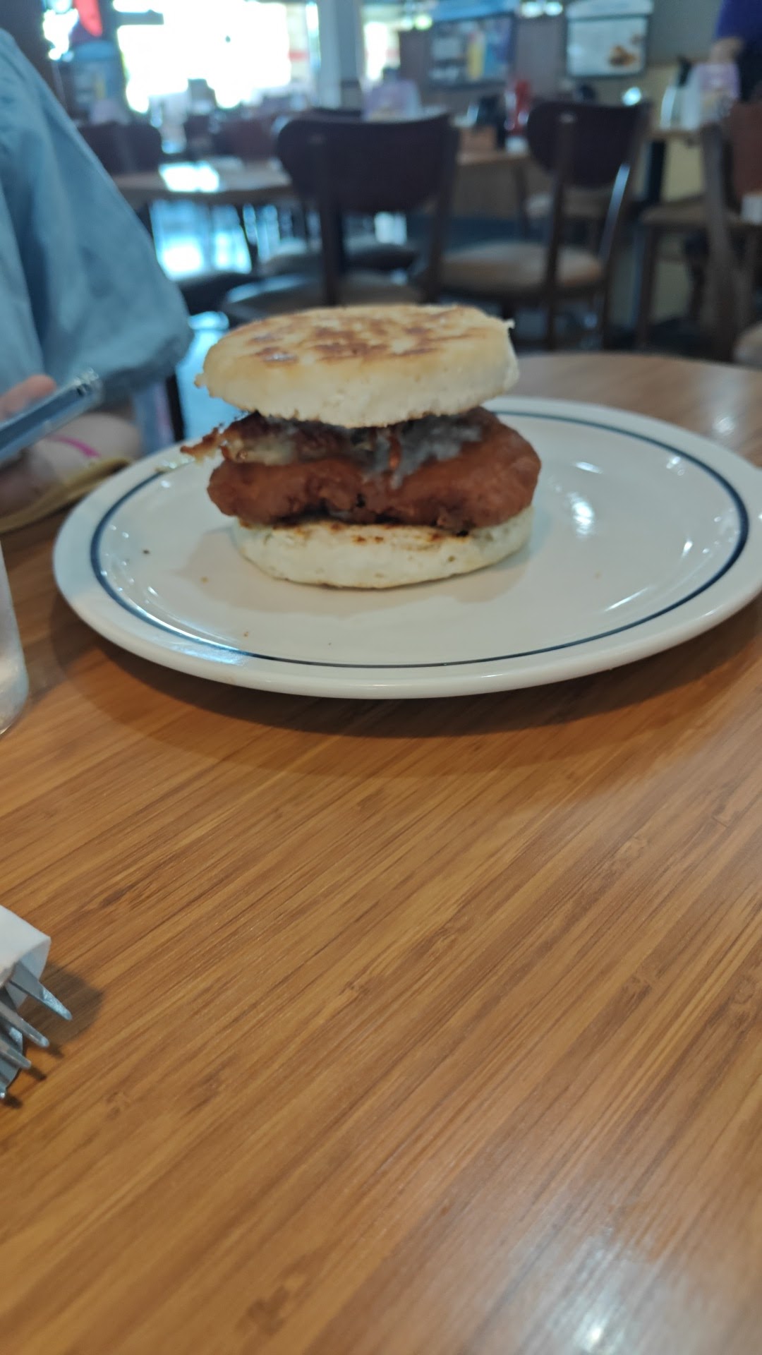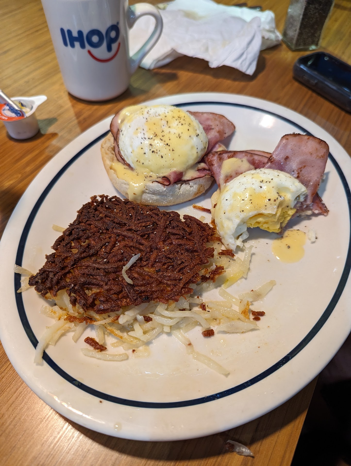 Read moreWhen I arrived at the IHOP, the waitress came by right away to take my order which was appreciated. Unfortunately, that nice feeling was soon ruined when the waitress brought our food to the only other customers in the establishment (one table of 5). They let her know that it wasn't their food, but she was somehow super surprised and confused. I tried to get her attention and say that the food was actually for my table, but she was "SURE" it wasn't and made sure to let me know it "wasn't mine" before heading back into the kitchen with the food. Not even a minute later, the food was brought to my table with a short "here you go". My classic chicken sandwich was immaculate, but it must have absorbed the quality out of my girlfriend's dish on the way to the table because her eggs Benedict meal looked awful. The hash browns were... Well... Browned on the top side, but in a burnt way; so much so that it maintained the form of the mold it was cooked in. The eggs on top of the English muffin were cooked till they were hard, robbing us of nice runny eggs, and to top it all off the dish was cold! Overall the waitress was super rude and the food was way overcooked. The bill felt like sand...