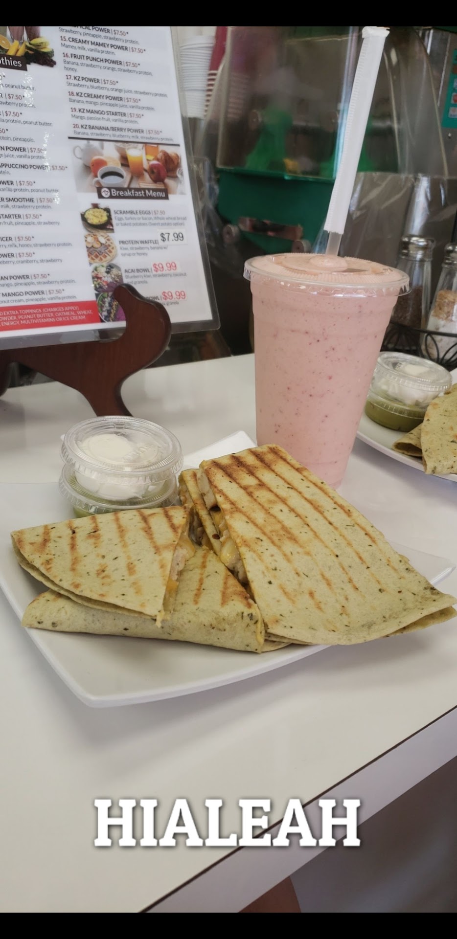 Read moreWe tried this spot this morning and it exceeded our expectations. Absolutely wonderful service from the ladies, they were so welcoming and helpful. The menu has so much variety and quantity, anyone can find something delicious here. We had the combo with a wrap, which we did get very full off of. The 3 in 1 green juice I got was super refreshing and fresh and the soursop juice was perfect! They have a very nice outdoor seating area where you can play music and choose what you want to watch and you can even rent it out for an event. The cafe itself was very clean and cozy. I highly recommend this place, I havenât found places like this in Hialeah up until now! Canât wait...