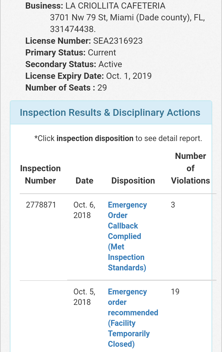 Read moreDear Truck Drivers, Fathers/Mothers & Tri-Rail/Metro-Rail riders. To the working class Latino American who frequent this cafeteria. On October 5th they had a surprise inspection. They were walloped with 19 violations one which included "Roach activity in the middle of the main kitchen," & "soil residue build-ups." The inspector also noted that their Pork, Croquettes, & Ham were cold. He was giving us a heads up that their food is kept overnight. Moreover, adding insult to injury, the inspector also observed that there was "no running hot water & no soap for the employees to wash their hands." He also noted that there's a big garbage can full of garbage blocking the entrance to the bathroom. Don't be fooled by the 4.4 star rating and their good reviews. The city inspectors always...