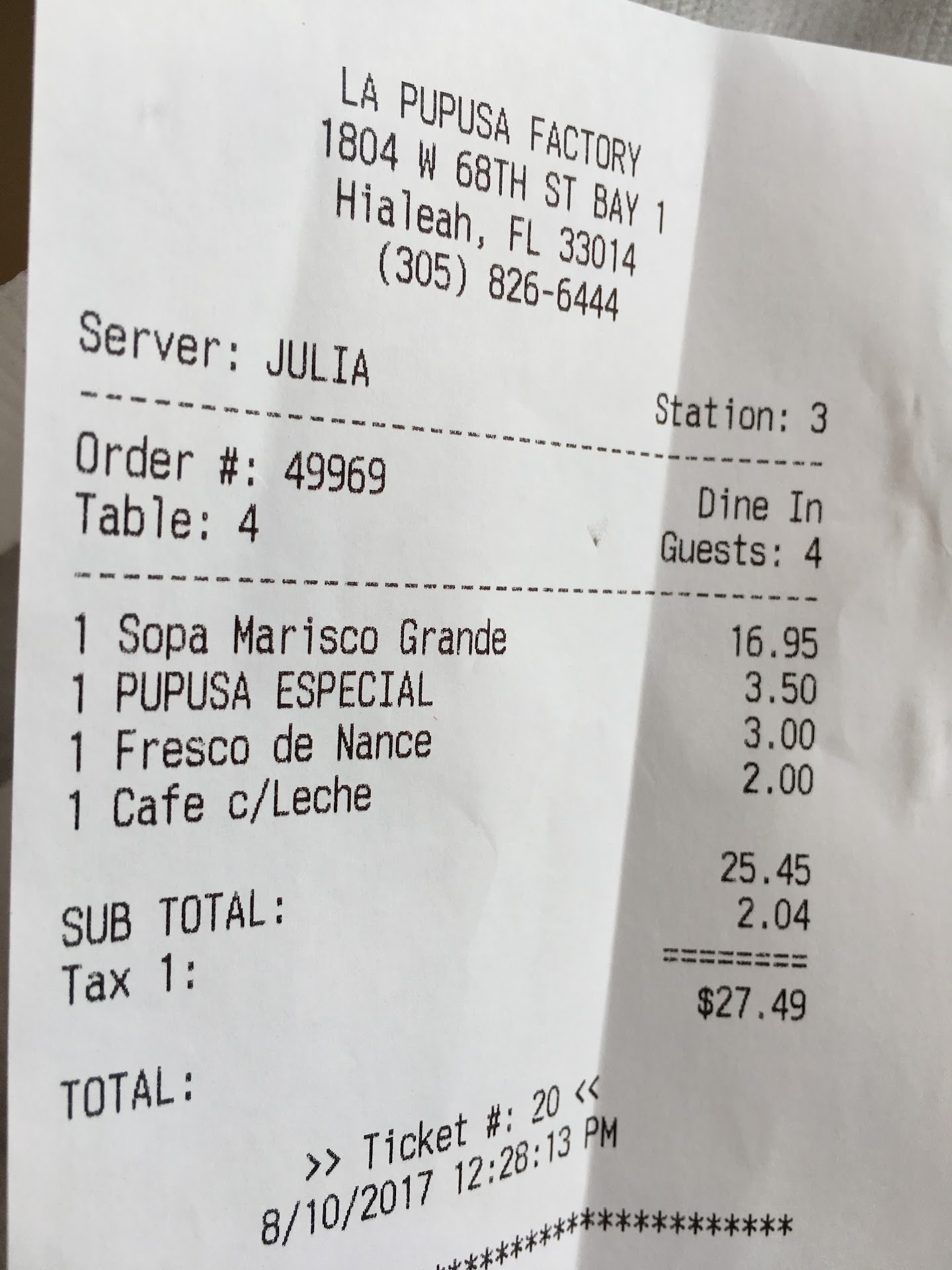 Read moreIf you never try Salvador Pupusas you do not know what your missing . This soft flour corn Salvadorian dish with tortilla texture you can ordered with refríes beans cheese and pork Chicharrón or a variation different Kinds of Pupusa just ask you waiter what difference kind they have and try them . One of this babies would fill you up the entire day. The Pupusa i tried at Pupusa Factory was no the best but it was ok not that flavorful nor that soft like in the best places I tried them. Nothing fancy here but there are much better places that makes Pupusas and I will review them later for you. The Big Marisco Fish Soup was not that good it tasted like something else or water with salt for that matter that is the reason of few stars for this place . Nice service but if you go here stick to the Pupusas that is the reason for...