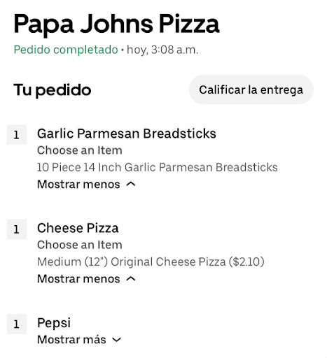 Read moreI order a 1 big box of pizza for me and my familia plus 1 box of the bread stick and a big pepsi, when the uber arrived he only gave me a small box with 6 slices of pizza and a soda I don't even know what it was. I paid 35$ for only small pizza and a soda ? They worker sucks they don't work properly. Won't buy again from you guys I ain't loosing my money again, and on top the pizza was cold, THIS PLACE SUCKS THEY NIGHT WORKERS SUKCKS. Just wait for the complains đ this happend now at 3:00 am december 1-2024. I'm going to show you what I ordered and what I recieved and you guys decide if buy or not. These people are stealing, check the white page its what I ordered and the others photo it's what I recieved not even the correct name either. YOU...