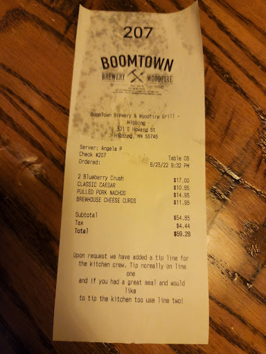 We do truly enjoy the food at BoomTown. We have always had good service at the location closest to us but we do travel to Hibbing frequently and so even though our previous experience with the service at this location was not the best we decided to try again. We were seated quickly as the dining room was not very busy at all. Our server was pleasant but seemed a bit distracted. We received the first part of our order but one of our drinks never arrived. We questioned our server who admitted that the drink had been forgotten and quickly brought it to the table. The rest of our order arrived and we thoroughly enjoyed our meal. The food was absolutely delicious and we likely ate more than we should have. As we were nearing the end of our meal a duplicate dish of appetizers was brought to our table by another server. We declined and said we could not eat any more. The server seemed confused and when they caught the attention of our original server from across the room it was indicated that the dish belonged to the table next to ours. After we finished our wonderful meal we waited for a bit for the check to arrive. When we received the check it seemed a bit higher (double) than I expected but I wasnât looking closely at the prices so I first thought maybe I was just underestimating the cost. A closer look however showed that we had been charged for two complete orders (it appeared to be the order for the table next to ours as best I could tell). When the sever came back several minutes later we pointed this out and the response was âOh thatâs a simple fixâ and that was it. No apology. Our check was corrected and dropped at the table only to have our server disappear again. We waited for several minutes with no sign of our server. My wife went to the hostess stand at the entrance to see if we were supposed to pay there while I stood by the table searching for our server. After what seemed like an eternity but was likely only a few minutes I was approached by someone who took charge in a way that gave the impression of a manager. An apology was given and we were cashed out quickly and efficiently. Love the food. Might still give the service another chance at some point but will probably choose to drive home and go to the location closest to home rather than stop here again in the immediate future. Still four out of five because overall the experience...