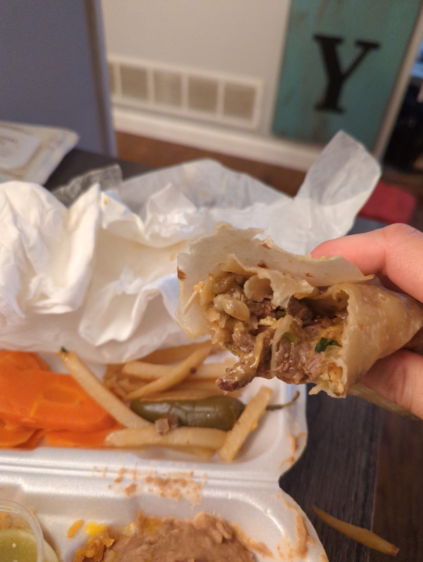I'm usually not one to complain but after this experience something has to be said....ordered an Arizona burrito (steak, potatoes, pico, cheese) little did I know what they are serving as potatoes in their burritos are basically straight from the freezer french fries. Absolutely 10/10 do not recommend. I'll be taking my money to the actual Mexican restaurant in hickman from here in out..... absolute...
