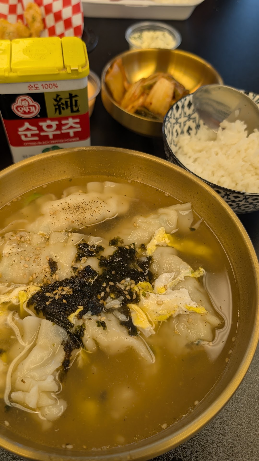 Tteokbbokki (rice cakes in spicy sauce). It even came complete with a side of fried dumplings and kimari, which is fried seaweed wrapped glass noodles that go perfectly with tteokbbokki. This is one of my favorite Korean street foods and one dish that Iām obsessed with. Iāve not found any restaurant that does tteokbbokki right in the entire South of the U.S., but this one was a winner!