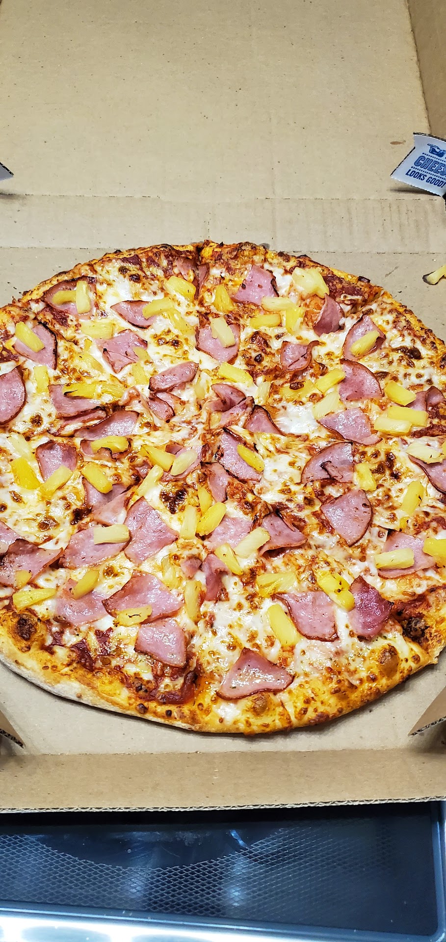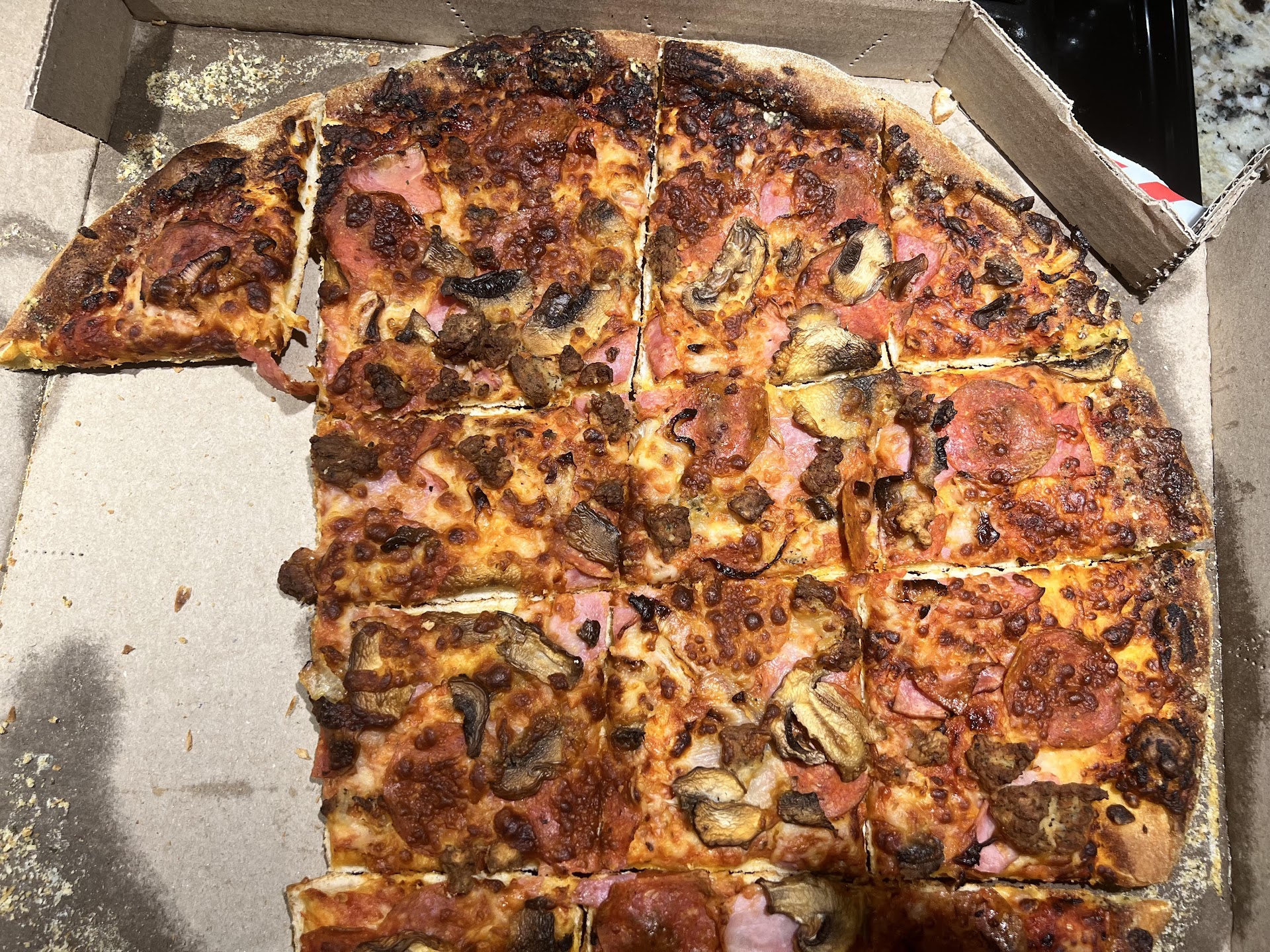 Last night (Saturday night), we had guests and decided to order two pizzas from this Domino’s location. We’ve ordered from this store frequently, and while we’ve had major issues with orders in the past, we never followed up on them. This time, one of the large pizzas we received was burned to the point of being inedible (photo attached). Each of us tried a piece, but no one could eat more than a bite because it was so dry and overcooked. The other pizza was fine, prepared just as we ordered.