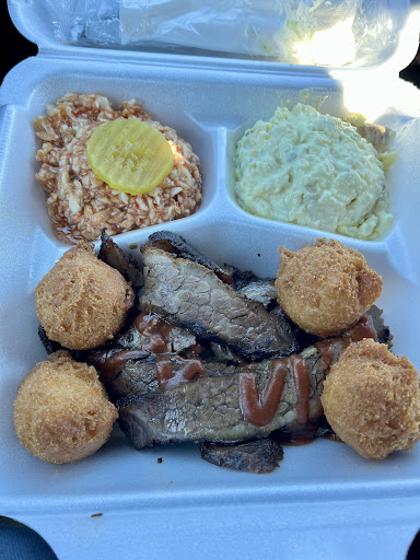 Friend and I stopped by here hoping for some good bbq and we came in with high hopes because of the reviews, but were very quickly disappointed. Their “bbq” sauces that they have at the table were all super thin and runny, one tasted like Italian dressing, one tasted like a sweet/spicer vinegar sauce, and the third tasted almost exactly like ketchup and had there not been a ketchup bottle next to it I would have assumed it was. Sauces aside the food was nothing great either both my food, the brisket, and my friends food, the chopped bbq pork, were very bland, didn’t have any of that smoky taste that you traditionally get in bbq. On top of that the brisket I was had was half fat, and the bottom slice of brisket wasn’t even cooked throughly, you could visually see that it wasn’t cooked well through which caused it to be extremely chewy. The hush puppies had no real flavor beside the oil from it being fried. The sweet potato I had was smothered in brown sugar, which depending on the person could be a good thing. The Mac and cheese was the only redeeming thing on my plate. The service, however, was good, but the food was bad enough for me to rate this any higher. All in all if you want good bbq I would not...