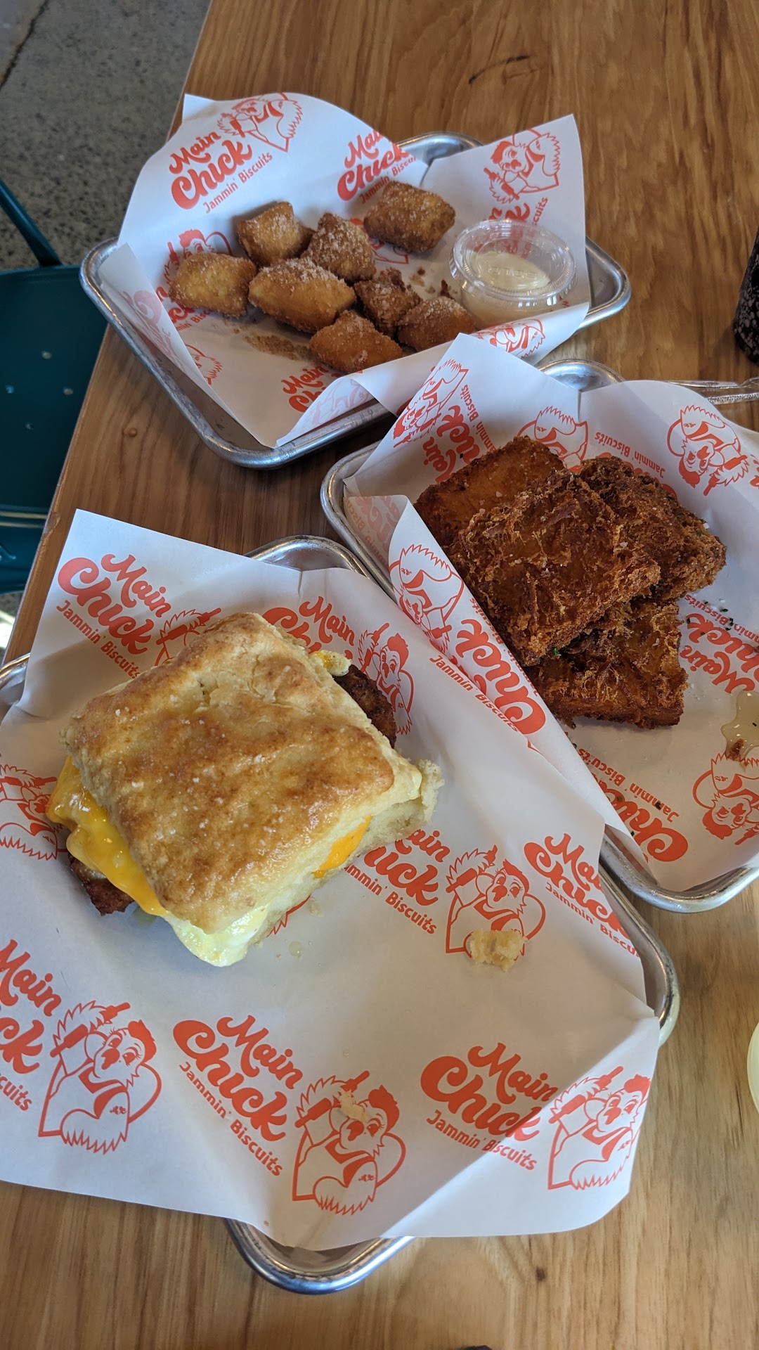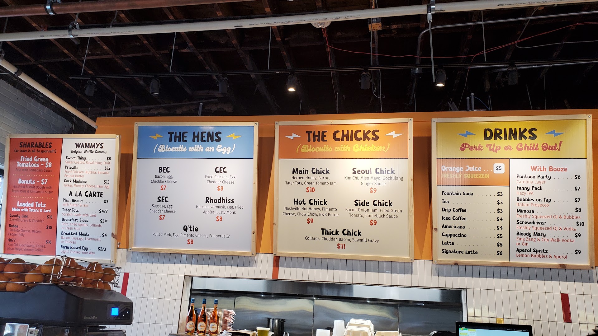 Read moreIf you're craving a unique perspective on traditional southern favorites, Main Chick Jammin' Biscuits serves them up so fresh you'd have to buy the farm, pluck the chickens, and pick the oranges yourself to get any closer to the source. Located in downtown Hickory just a couple of blocks from The Square, these folks are grinding their own sausage (which hits your plate as a serving larger than a fast food burger), squeezing OJ at the counter right in front of you, and slinging farm fresh eggs onto the fluffiest biscuit in Western NC (with homemade sawmill gravy if you ask nicely). If you're feeling more adventurous, order your chicken Nashville hot, or fling your taste buds farther east with some homemade kimchi on your bacon biscuit. You can quite literally taste how fresh everything on the menu is, and you'll suspect that someone's grandma is in the kitchen. Our crew of six ordered nearly one of everything on our first visit, and each one of us, ranged from age 7 to 50, said the same thing about every bite ... "This is great!" From the coffee, to their version of hashbrowns - a substantially sized cube with six crispy sides that will satisfy your crunch cravings for days - to the main dishes, everything was exceptional and more than reasonably priced for the quality of food and service. We found them online - as you likely have if you're reading this - and now we're telling everyone we know, and with this review, even...