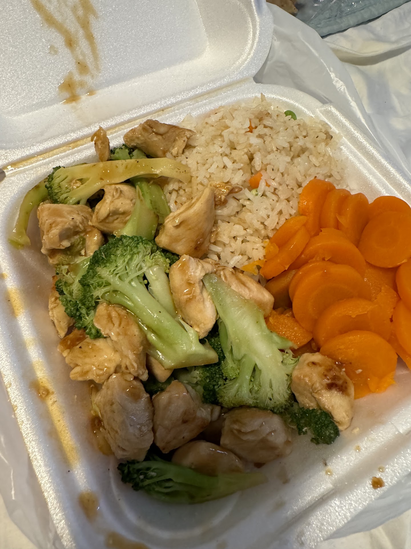 I ordered the Teriyaki chicken with carrots and fried rice. My food was delivered extremely quickly; however, the dish was mediocre. The chicken was lackluster and the carrots tasted like they were from a box. The fried rice was a complete disappointment, it was essentially rice with some carrots and corn.