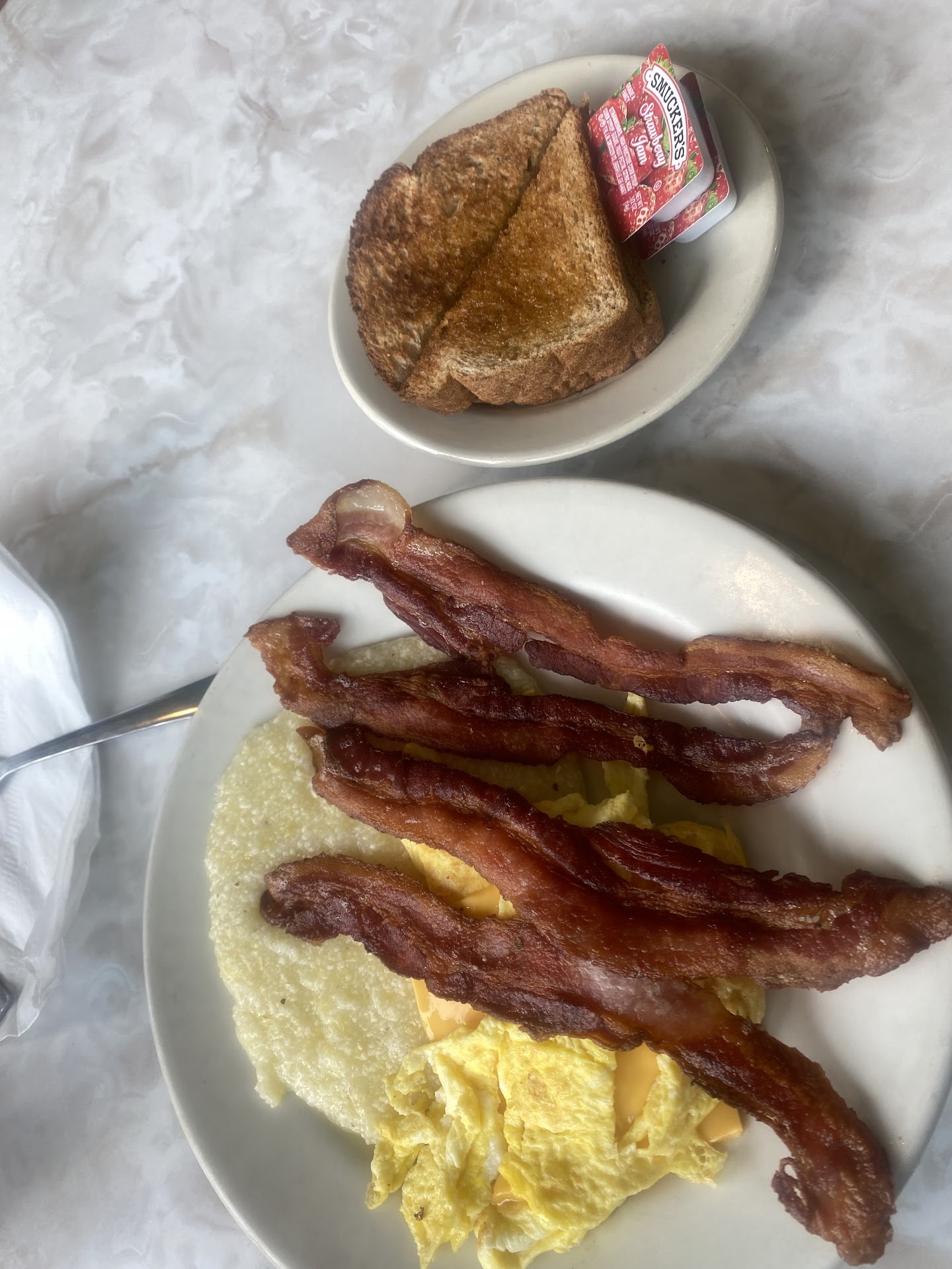 Bacon: good taste. Could have been a little more crispy. Also, it was cooked about halfway early in the morning. I know this because I saw the Cook take it out of the bin and put it on the grill to finish it the rest of the way. This is a very common practice in this industry. Iām not sure if it bothers me or not.