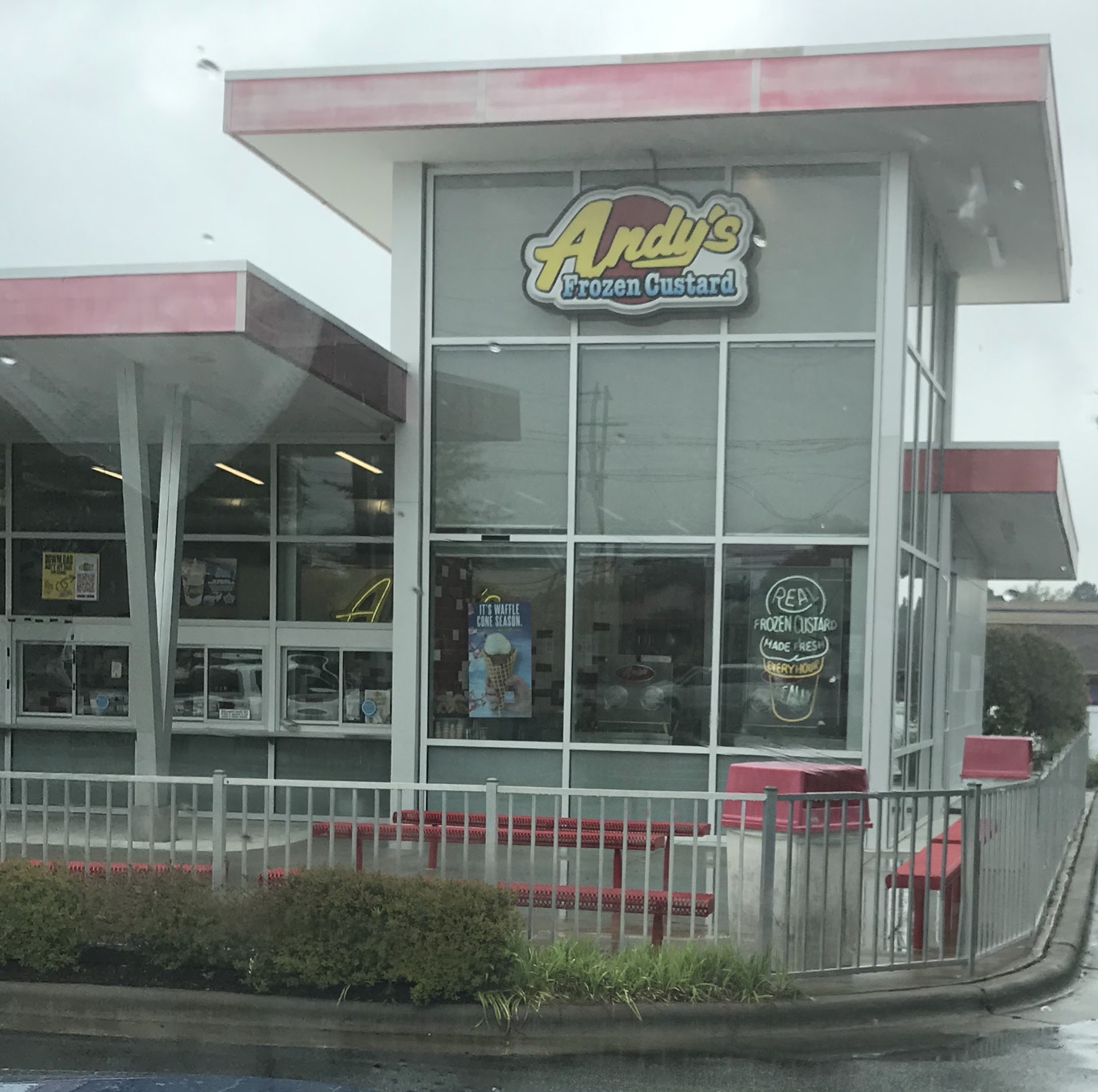 Weather Report: A rainy 53 degree Saturday. Our mood was iffy with a very good chance of snippy. Do you know what turned the day around? A trip to Andy’s Frozen Custard! This is a drive thru or window pickup establishment, but they do have outside seating. Hubs got the chocolate custard in a waffle cone. I got the Snow Monster Concrete. It was vanilla custard with sliced strawberries and melted chocolate chips. Wait. What? Melted chocolate chips? Isn’t that just chocolate syrup? No sir/ma’am it isn’t! They melt the semisweet chips but when they add that to the frozen custard, it refreezes into what I can only describe as chocolate flakes. Chocolate FLAKES! It was delicious! I ate and enjoyed every bite. My pictures don’t do the flavor justice but I tried. We used the drive thru and then sat in the parking lot to eat. They were really busy and the sign said they make custard every hour. I don’t think they are bragging, I think that’s out of necessity. Do yourself a favor and try them out. Rain or shine, you...