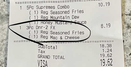 Maybe about two hours later, we get a text message saying our uber driver is on the way with our order, well after we had already made other plans. We did not make an UberEats order, this was a bit off-putting for us. Regardless, the uber driver arrived and delivered two 4-piece chicken tender meals with random sides and drinks, definitely not what we ordered, not equivalent to the cost of the family meal we ordered and still no refund in sight. We had already made alternative dinner plans at this point.