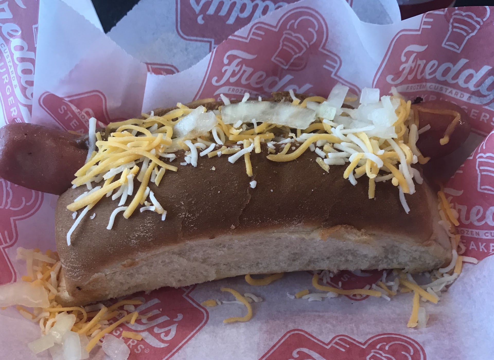 Now the food. We both got the double with cheese and Hubs added bacon. The combo includes a drink and their delicious, super skinny fries. Due to Covid, they no longer have the special Freddyâs Sauce in a pump, but they do give you hermetically sealed pods which is actually nicer. The burgers are truly smashed so you get the crispy lace edges. We also got a chili cheese dog with onions. The beef hotdog was good and was longer than the bun. Sadly, only one side of the bun had been grilled, they needed more chili and they werenât hot enough to melt the cheese. In the future weâll stick with the burger and fries. I also got the vanilla frozen...