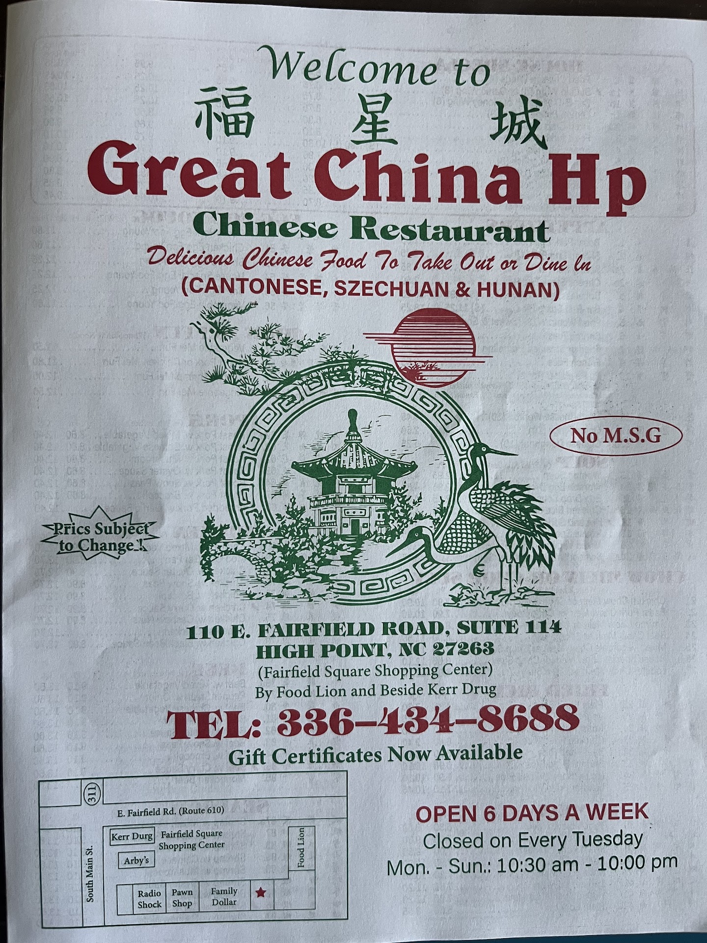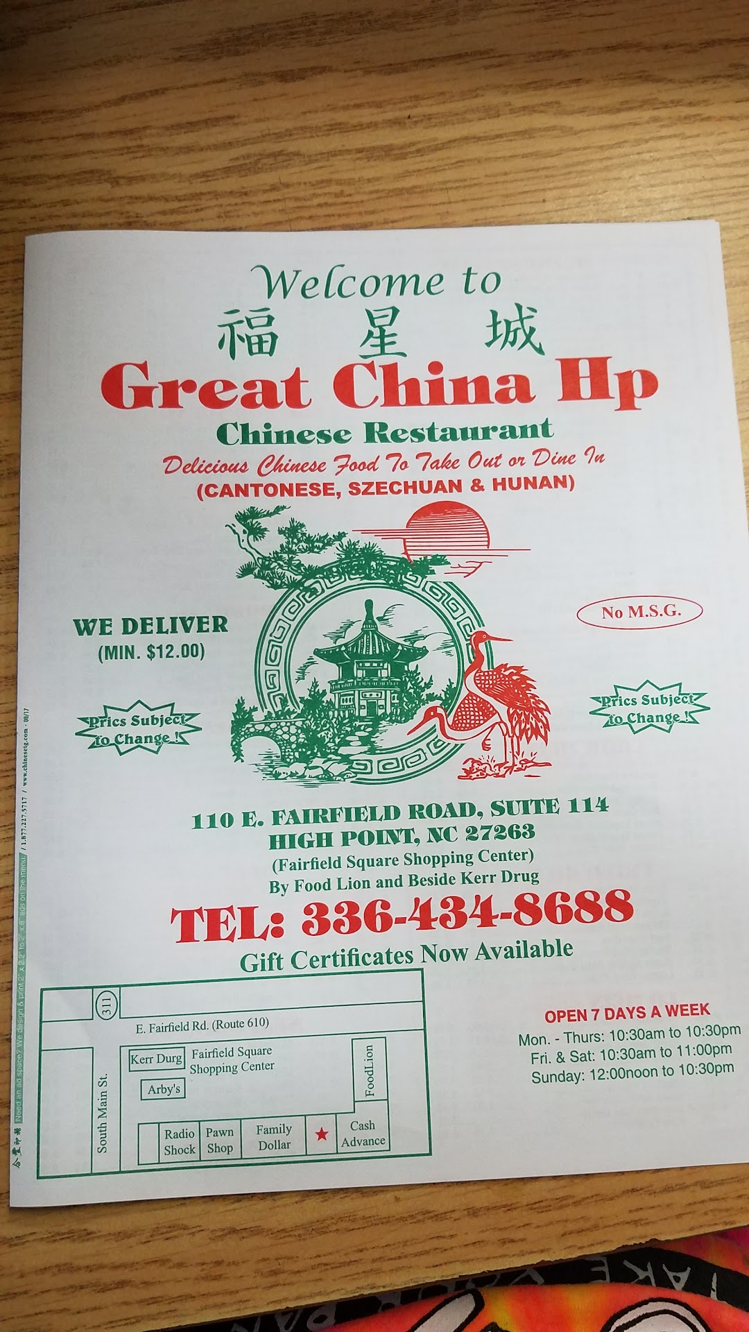 Read moreI ate at Great China Restaurant in High Point on Sept. 5 2017 at 6PM. Yuck. I asked for extra sauce on my General Tsos. The General Tsos ended up having very little sauce. I complained to the management and the chinese guy just told me We fix all of our general tsos like that Then when I asked him to add more sauce, he said I will have to charge you for another General Tsos order. Why couldn't he just fix his mistake? I told them that wasn't fair and he said You don't like it, I'm sorry. Didn't even attempt to correct the order and give me more sauce. Instead tried to charge me for 2 orders! Outrageous