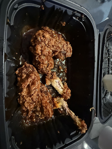BISCUITS: were pale and white, yet somehow hard as hockey pucks. They went in the trash: My dogs turned their noses up at these biscuits. FRIES: Cold. Clammy. Gluey. Gelatinous. The dogs did find them palatable and would have eaten them all, but I feared they might contract a disease. CHICKEN: Was good. Hot. Crispy. Flavorful. (I’ve never seen wings with so little meat). MAC N CHEESE: The container was approximately 1/3 full. On top, was a scab of burnt cheese. Underneath, the Mac n cheese was good.