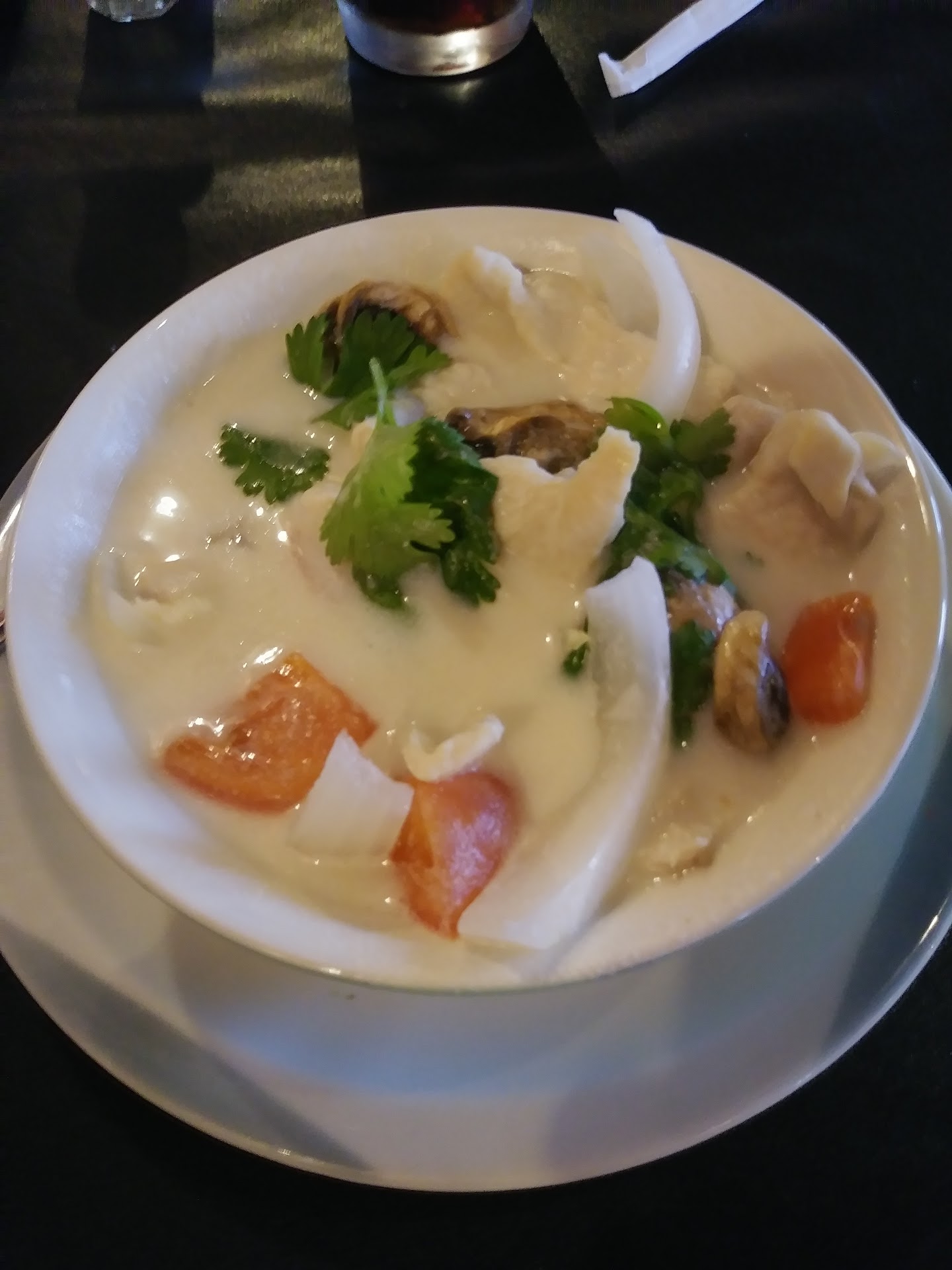 We ordered hot Ginger tea, Tofu Tom Kha soup, Pad Thai (I know but we always ask if they can make it with wide rice noodles, you should try it that way), and, Massaman Curry. The tea was good but did not prepare us for what was to come... the soup and food was simply amazing. I can see why people who are used to "Americanized Thai" would not like this because it was a definite step to a level of Thai which was so much better but unique.