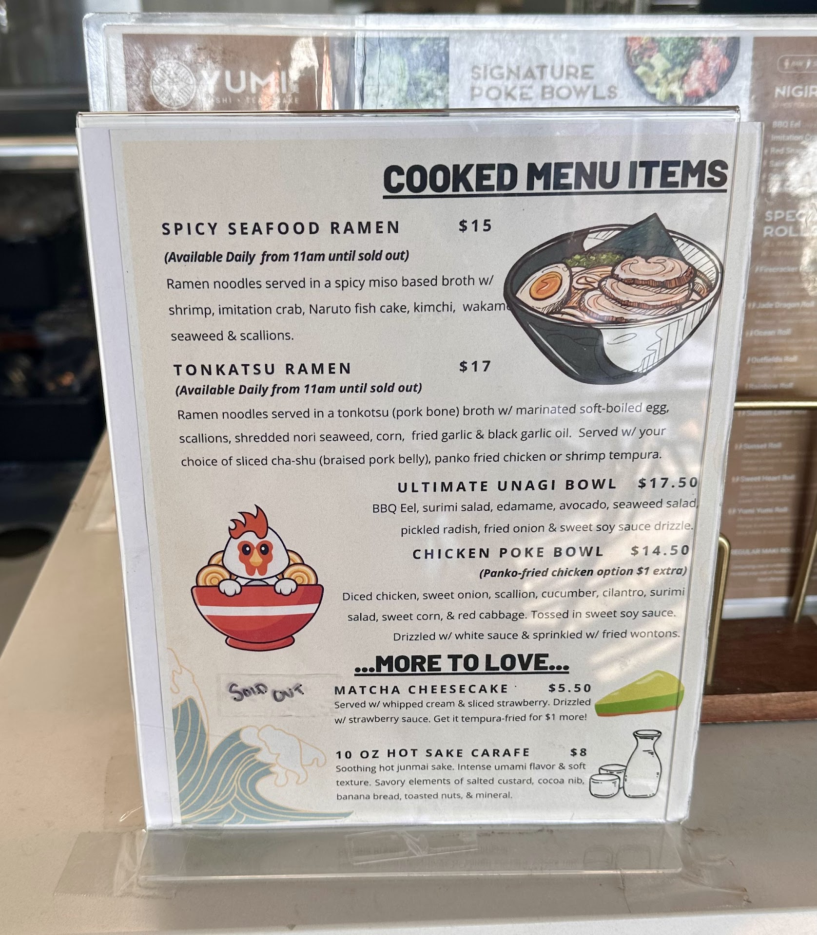 Stock and Grain is located next to Truist Point ballpark. That makes it a perfect location to grab a meal before any soccer, baseball or other event. So today before the High Point Rockets Baseball game we decided to have dinner here. After walking around and checking out the menu at the various food court spots, we settled on YUMI. They had a great selection of sushi, poke bowls and ramen bowls to satisfy everyone in our group of 5. They also have some great Japanese beer & Sake. I got the Tokatsu Ramen with the pork belly in a mild broth. It had a little kick but I probably should have gone up a level for a nicer kick. They gave a decent amount of pork belly and were not stingy. The broth had corn and scallions, shredded nori seaweed with a garlic oil. A great combination with some good noodles that filled you up to the point I felt bloated…..I’m sure the Diet Coke did not help! My wife got the same with the Tempura Shrimp which comes on the side. She got zero spice and regretted it so she got a side of hot sauce. My kids went with Poke bowls and they both loved them so I will take their word on it. Overall a good meal but a bit pricey for a place where you pick up your own order and then clean up after yourself. As far as service, not much to comment on since you order at one end of the counter, get a beeper and then pick up at the other end when it’s ready. The court itself is great because of the different selections but you need to hope that the people before you clean up their table when done if not you will be cleaning it yourself. That’s my reason for a 3...