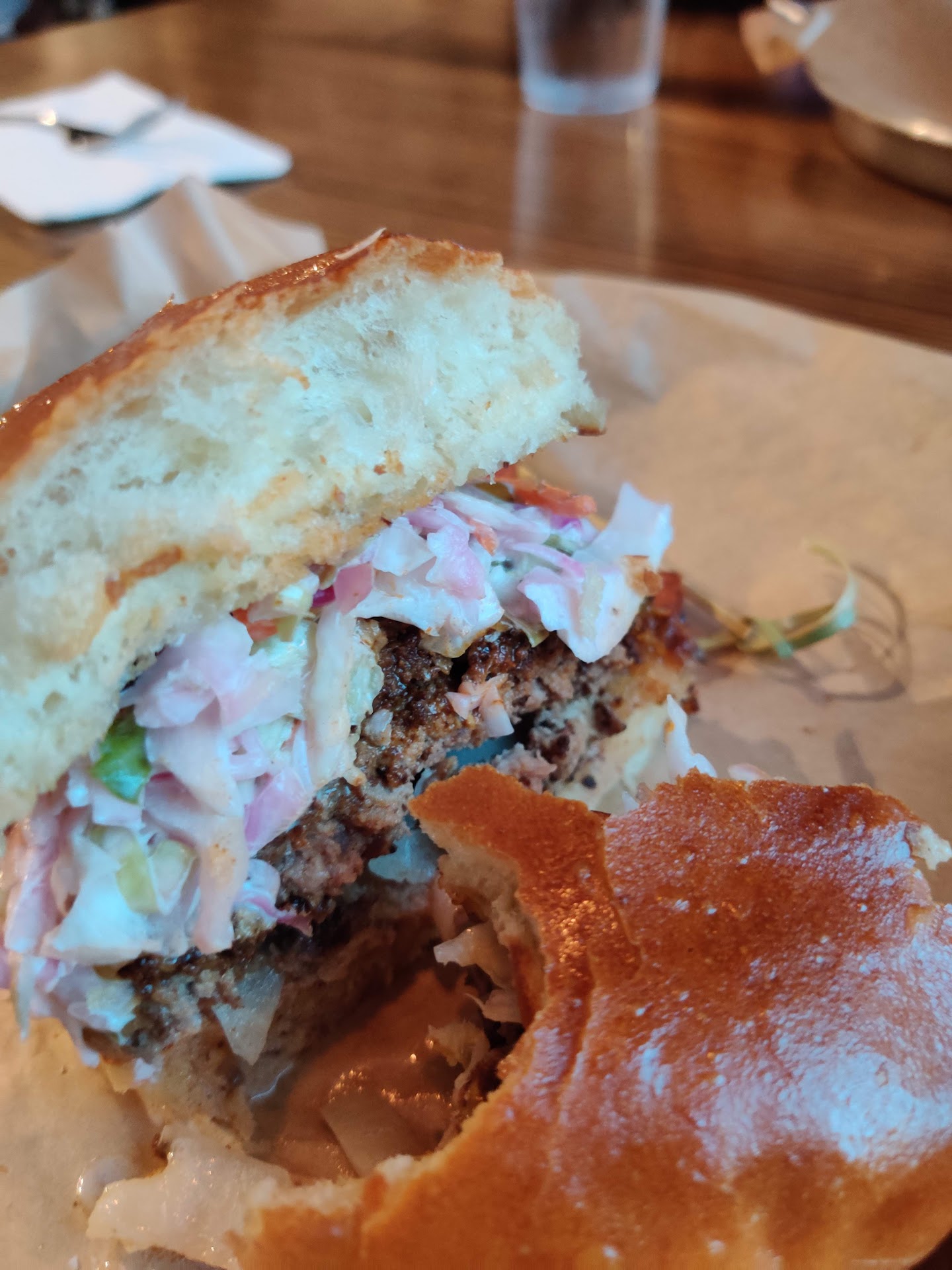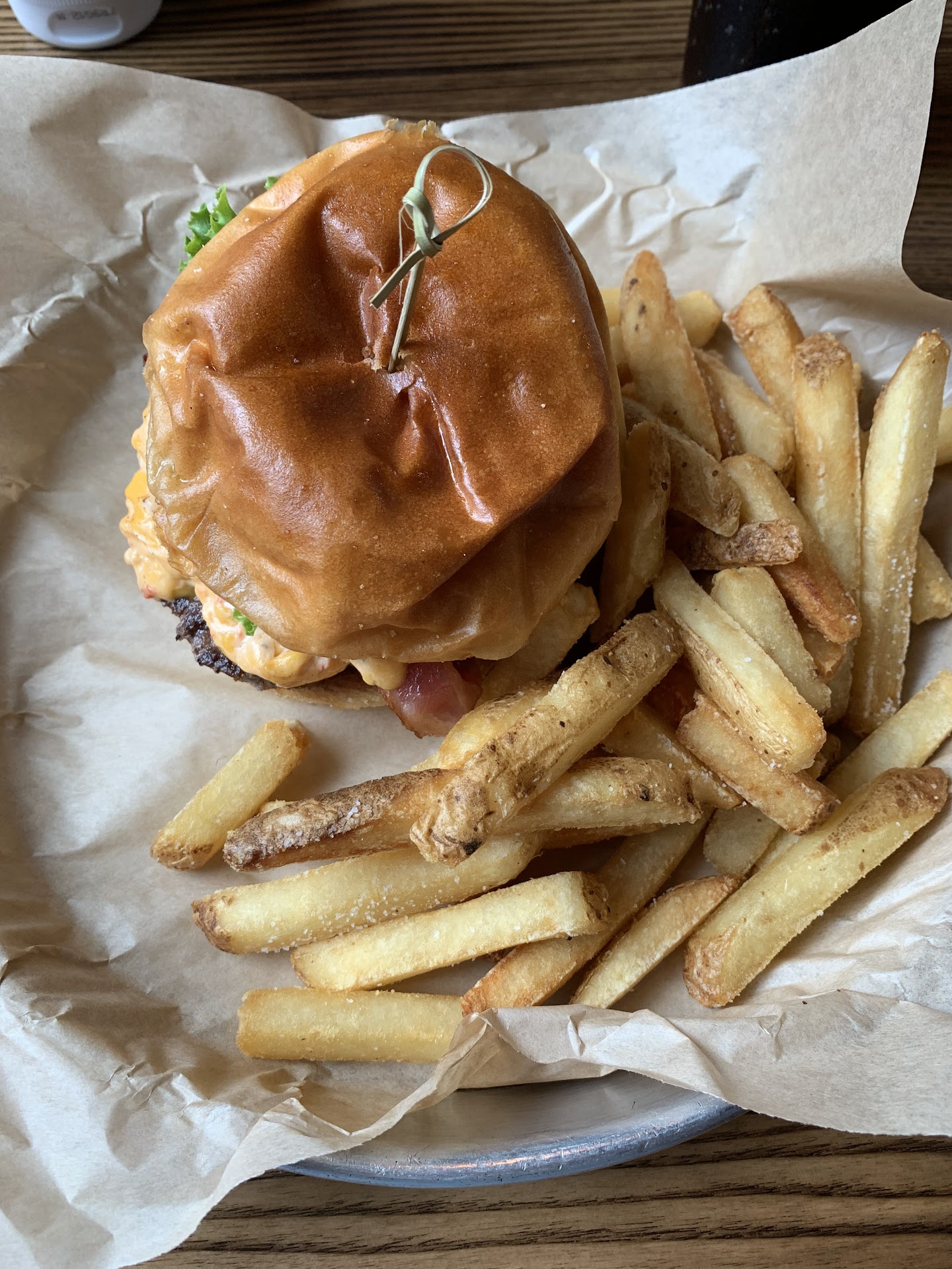 The Bacon Pimento burger was delicious. The patty was generous and flavorful. I ordered it medium but it was medium well, but I can forgive that. One thing I really liked was the bun—it held together masterfully where weaker buns would have disintegrated into a disastrous mess. This is not to say the bun was tough—it just steadfastly stayed intact. The fries were very good. The table next to me was ranting about the sweet potato fries—best they’ve ever had, but I can’t say from personal experience.