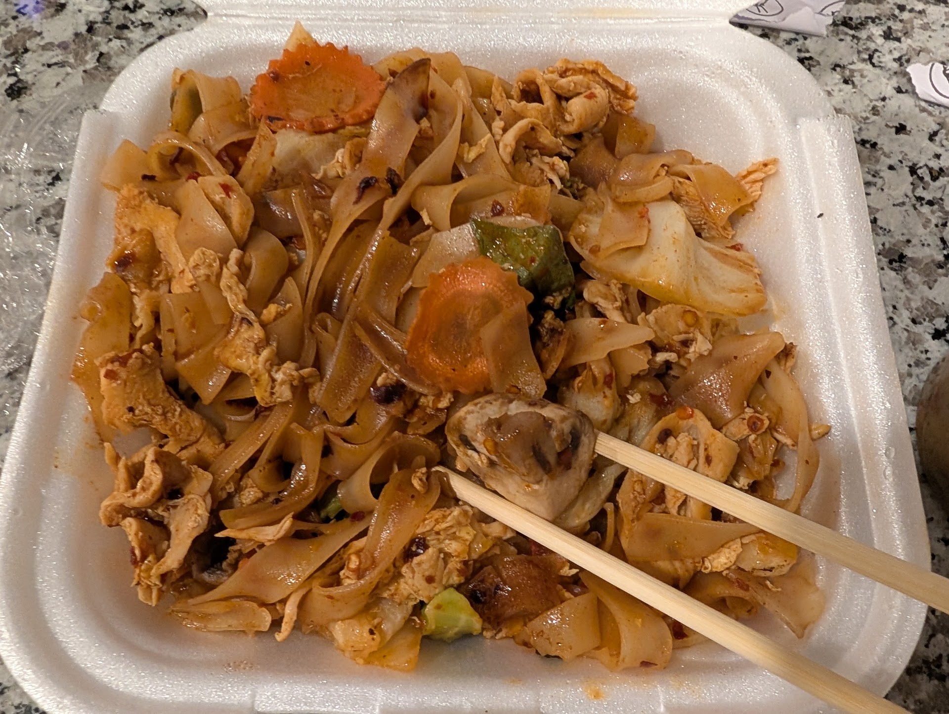 The bigger issue for me was the packaging: the hot drunken noodles were placed in a styrofoam container that had partially melted into the food, leaving behind a faint taste of the container itself. This isn’t just unappetizing—it’s a legitimate health concern. I’d highly recommend the restaurant switch to safer, heat-resistant containers for hot dishes.