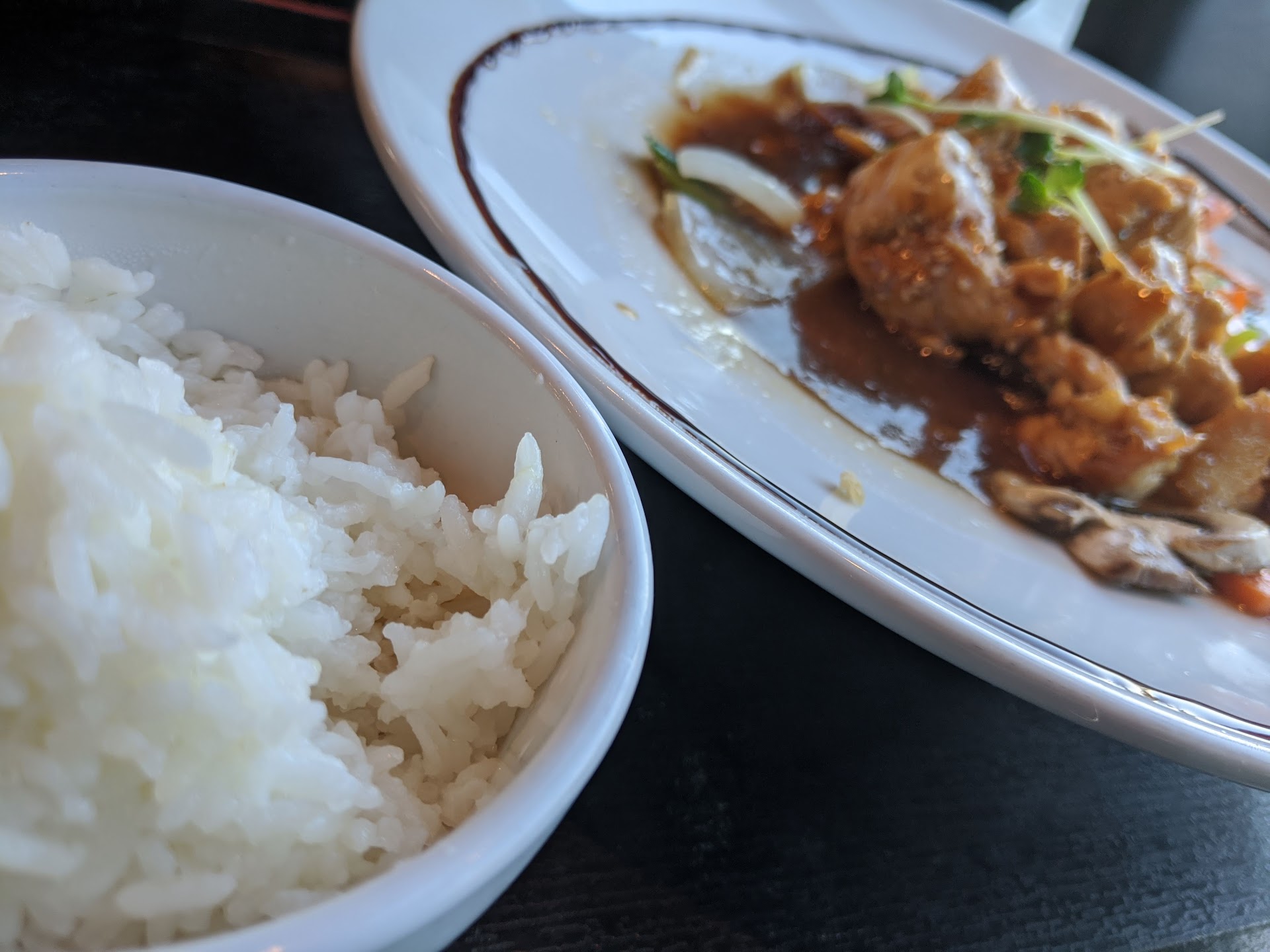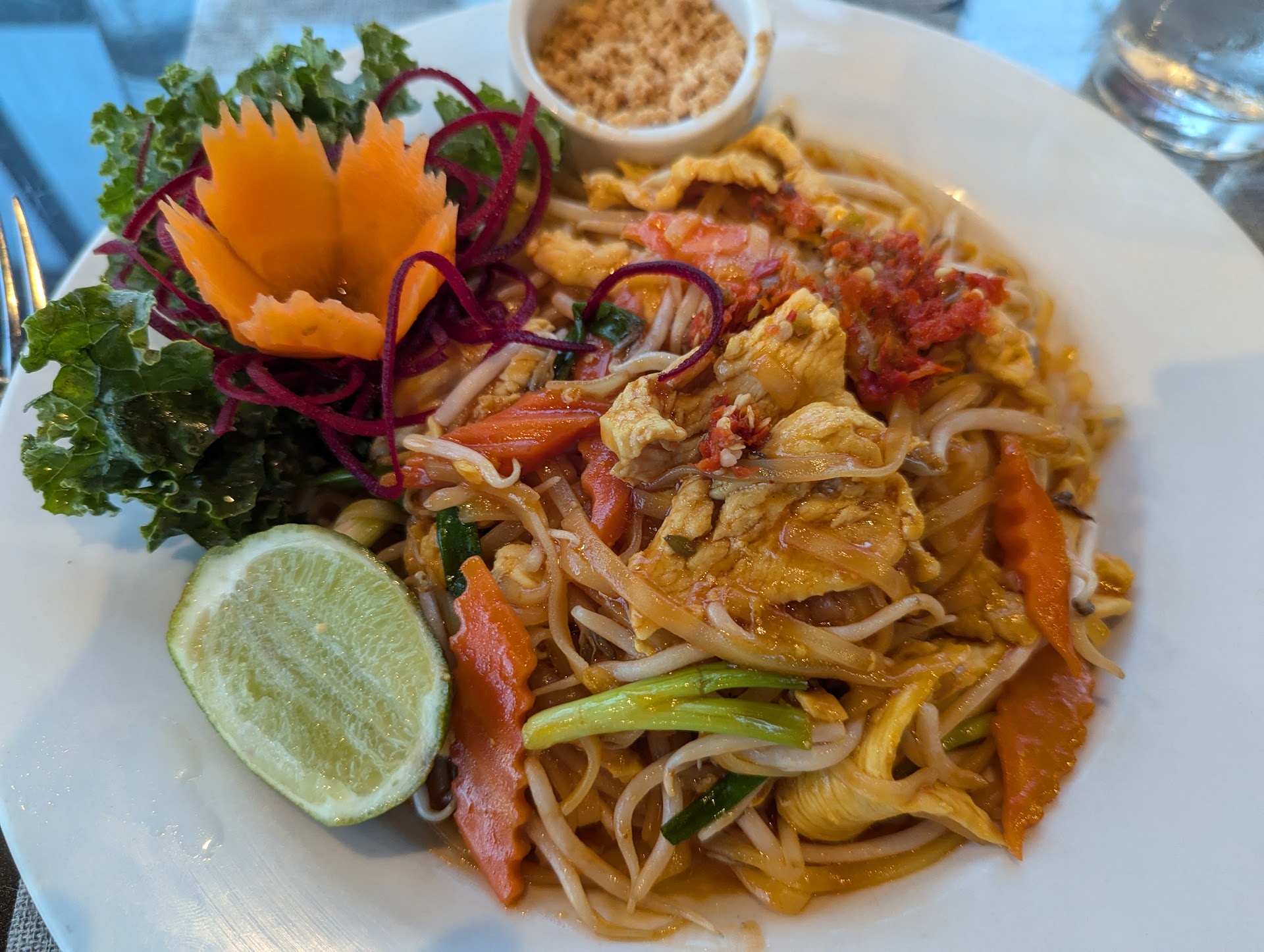 I had a Pad Thai craving and, my wife and I ended up going with a chicken Pad Thai, a beef pineapple fried rice, and a Crab Rangoon starter. The food was tasty (good amount of sauce on the noodles and sweetness balanced with curry notes in the fried rice), and The Basil Leaf will match your desired spice level. While the plating aims for aesthetic sophistication (i.e. carrots cut into a flower shape), serving the rice in a rectangular block was an odd touch. Both entrees were generously portioned. At $15 and $17, neither broke the bank though the prices are a bit higher than the nearest competitor.