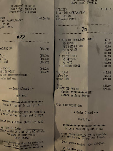 Shady Refunds when they screw up twice... BF ordered a burger and the lady gave him some other burger with something on it he did not order, when he tasted it he told the lady that they made the wrong burger and she said she needs the burger back and takes the burger with over half my BF's large order of onion rings on the lid of the burger container. That is when he told her to just refund and put it back on the card. She refunded $5.79 plus tax for a burger that we paid $6.99 plus tax, well he caught that right away and confronted her about the difference in cost and refund so after some math she said "I owe you a $1.20 my bf said what about the tax on that $1.20? she then tries to confuse my boyfriend by saying the tax was already refunded on the receipt for $5.79 which was 43 cents. my bf told her "tax on $6.99 is more than 43 cents". This was more than a mistake there was no item on our original receipt for $5.79. (1st) she took his order wrong like she did not even hear him and he caught it and corrected her (2nd) but the she got it wrong anyways again (3rd) she takes almost all his large order of onion rings that was paid for, no refund for that (4th) refunded less money than owed, based off a amount not on our receipt