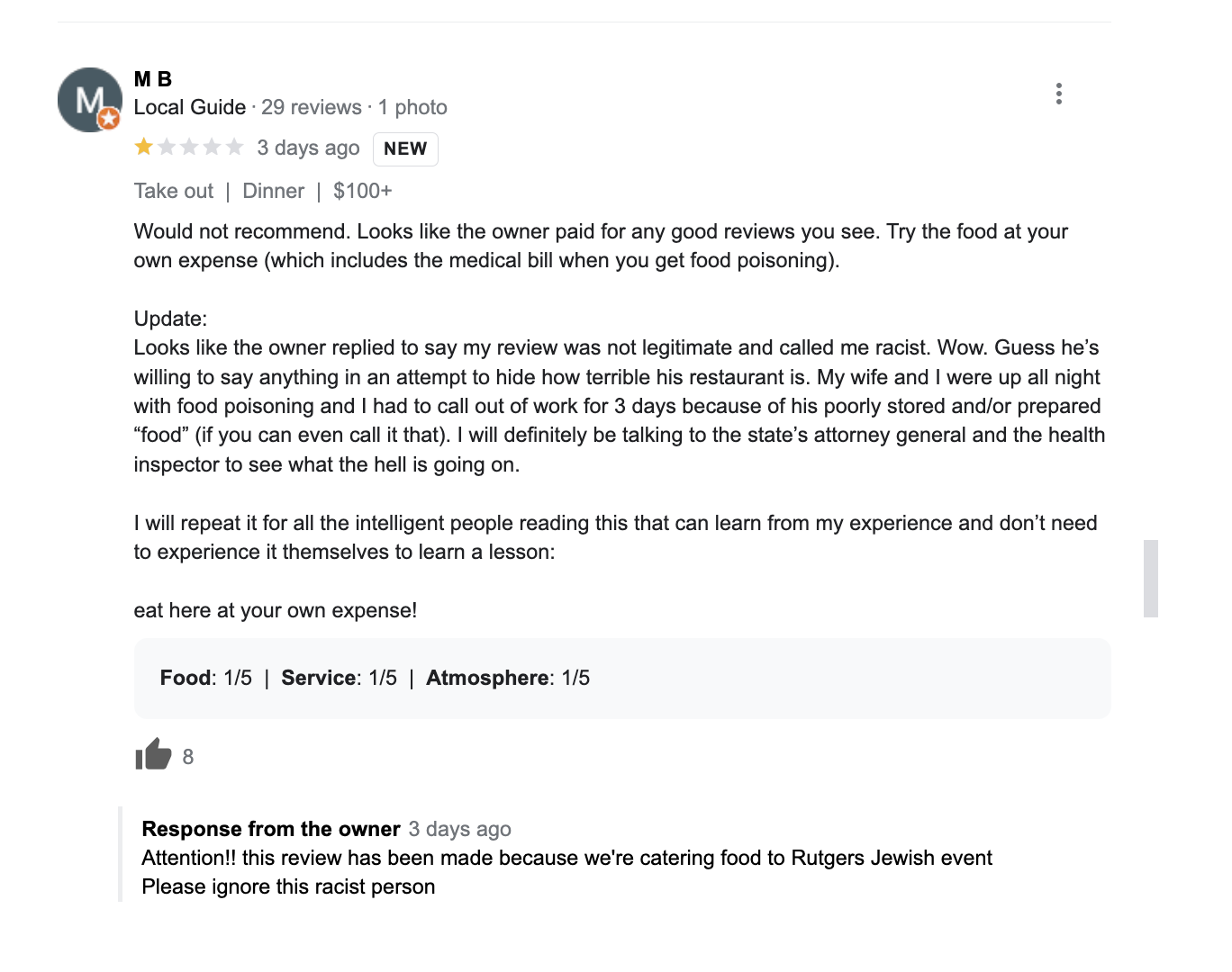 Everyone's free to like or dislike the food or experience at a given restaurant—but when the food, pricing & wallpaper in an eatery are portrayed in broad, unsubtle & mostly unspecific terms as irredeemably awful, with practically an admonishment not to eat there… it's a very safe bet someone is abusing the "consumer review" concept out of personal bigotry. These people stop at nothing… but we already know that.